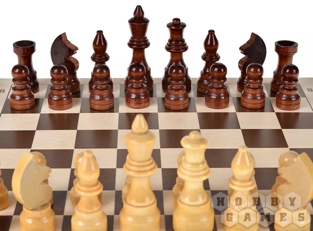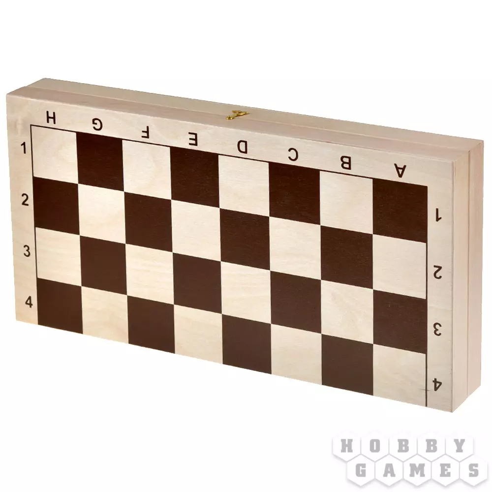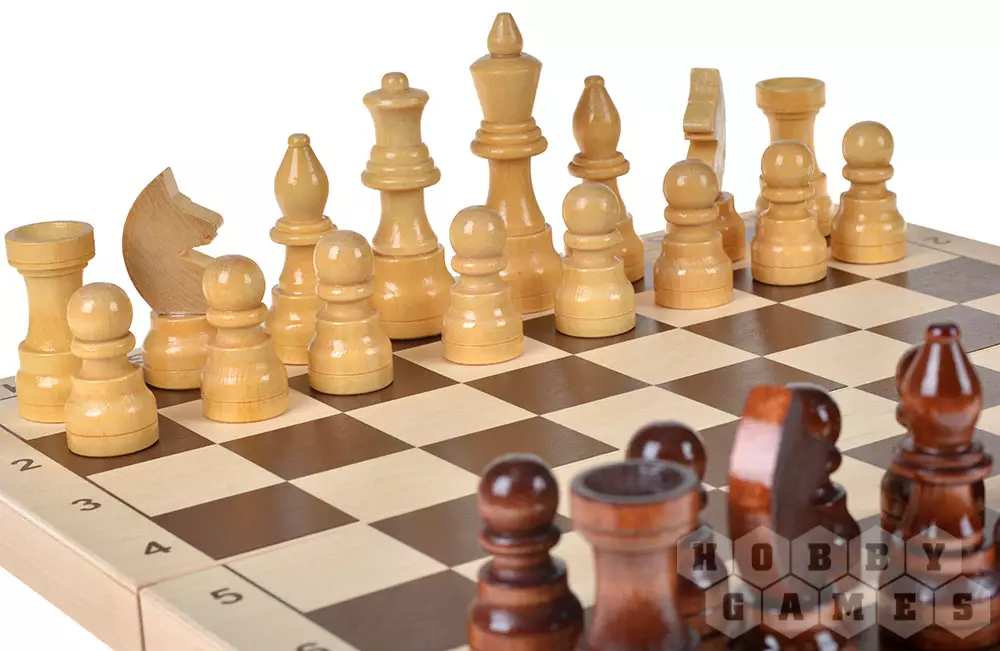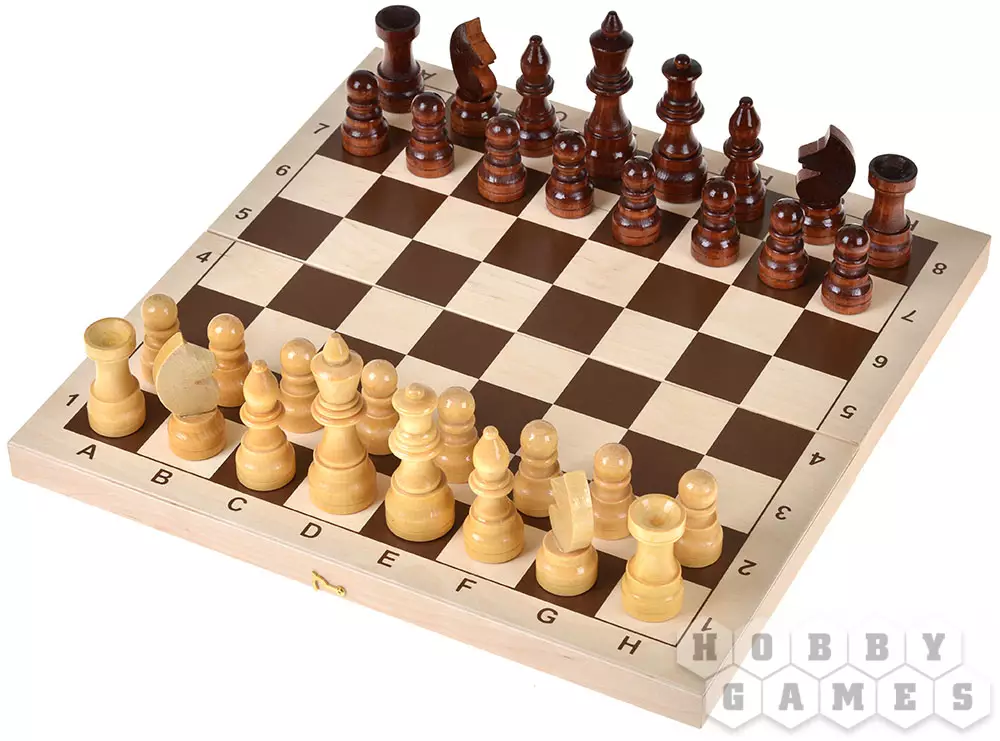 Доска и фигуры сделаны из дерева и покрыты лаком.