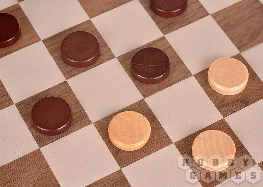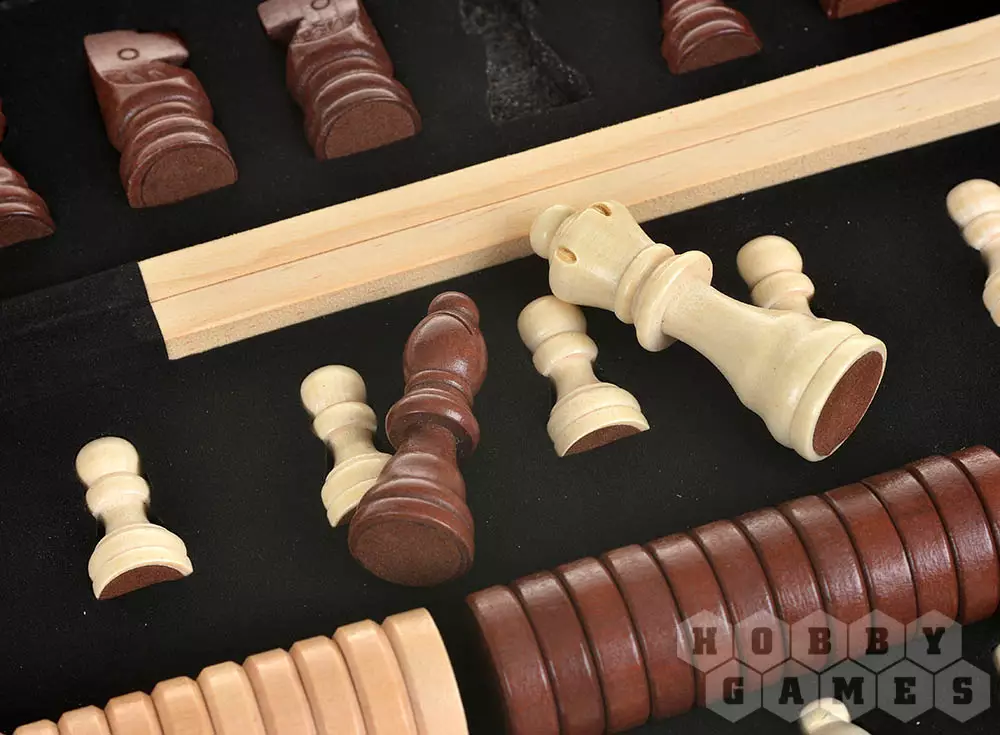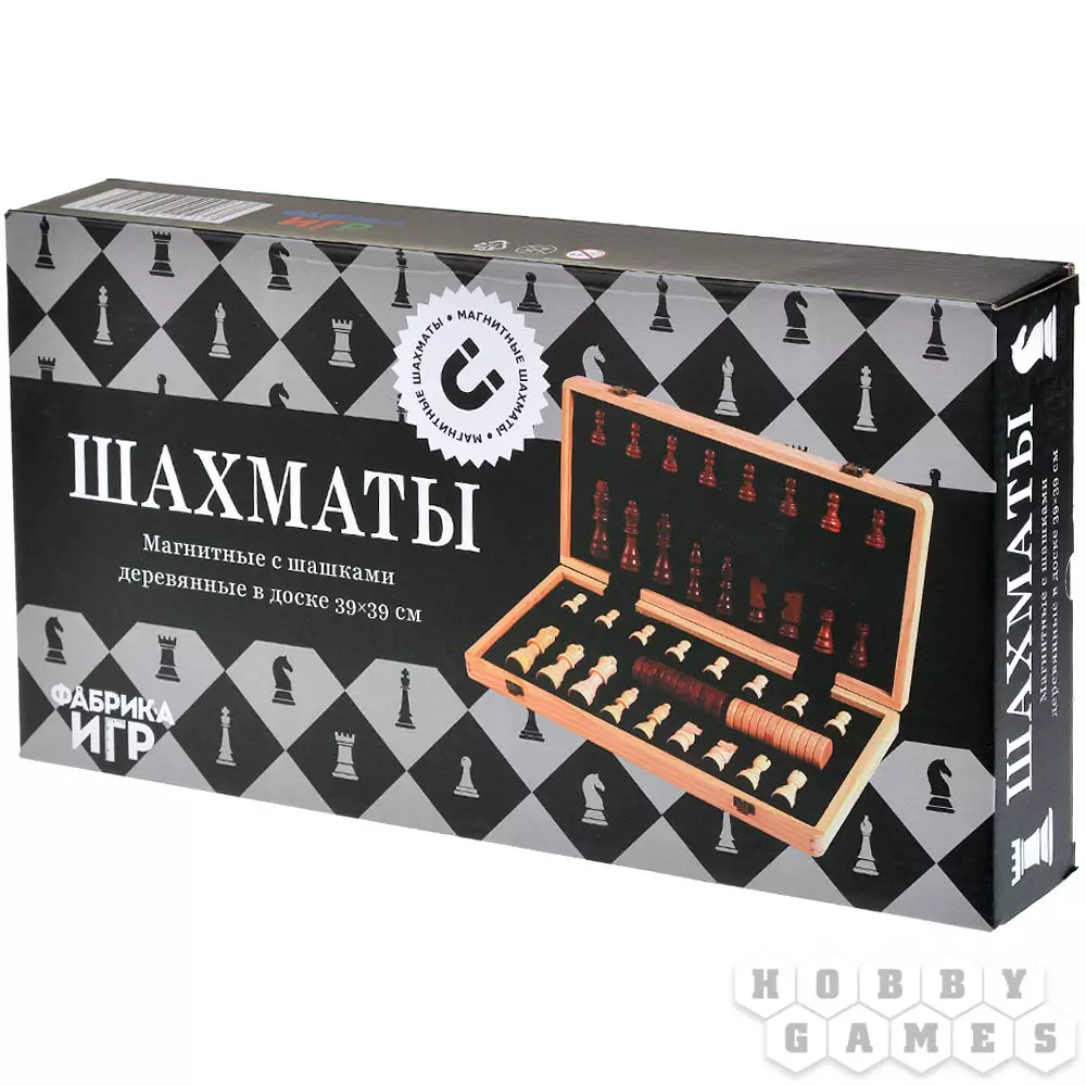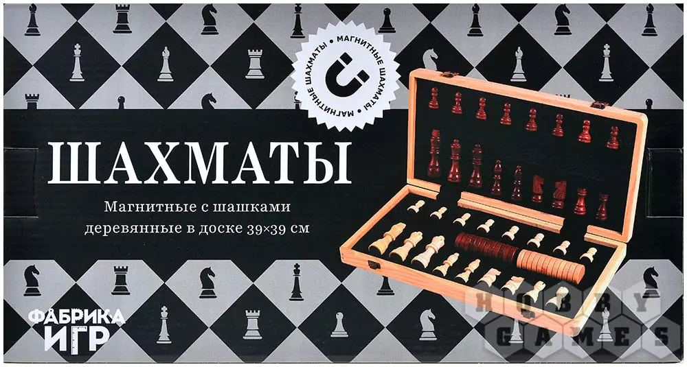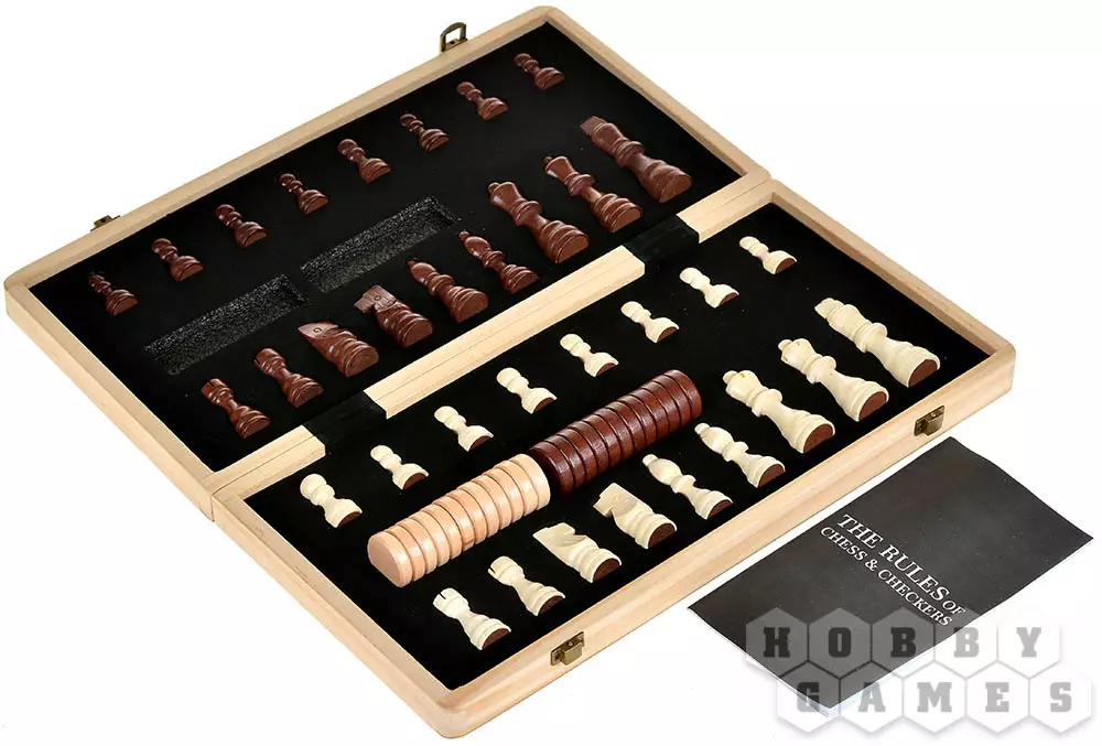 В комплект входят набор магнитных деревянных фигур, набор шашек и игровая доска.