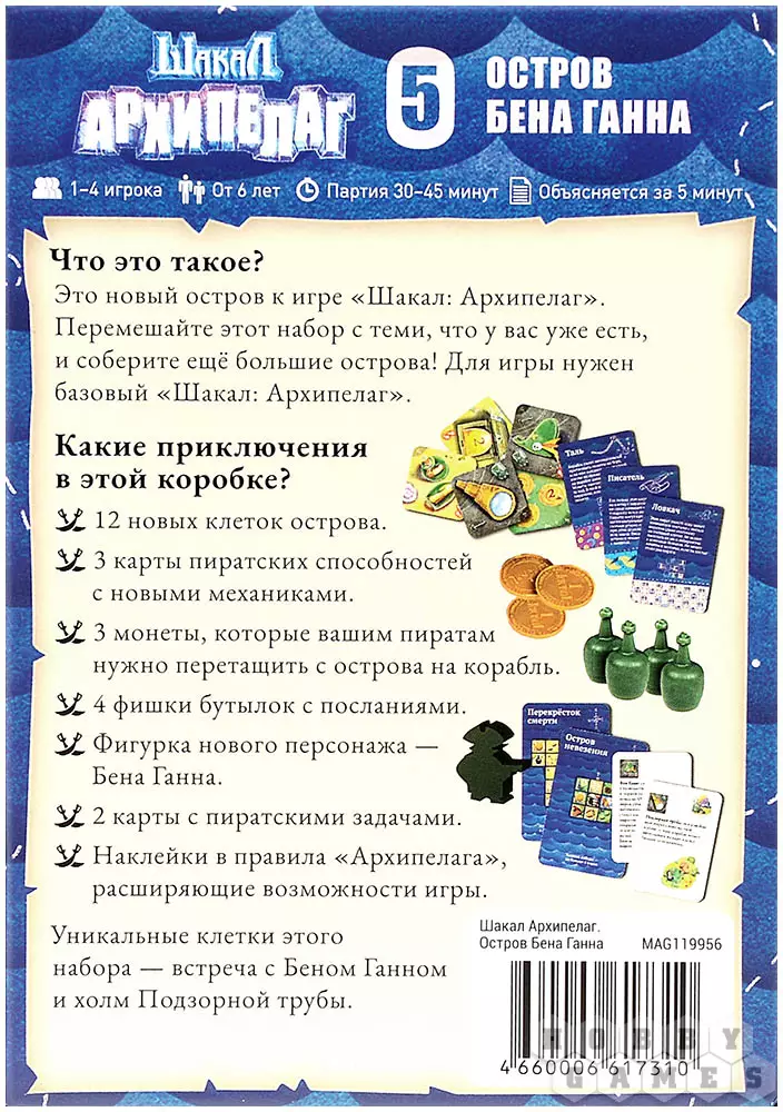 "Остров Бена Ганна" добавляет в игру новый остров. Смешайте дополнение с наборами, которые у вас уже есть, и соберите сушу ещё больших масштабов! Исследуйте новые клетки, встретьтесь с самим Беном Ганном, тащите сокровища на свой корабль и станьте самым удачным капитаном!