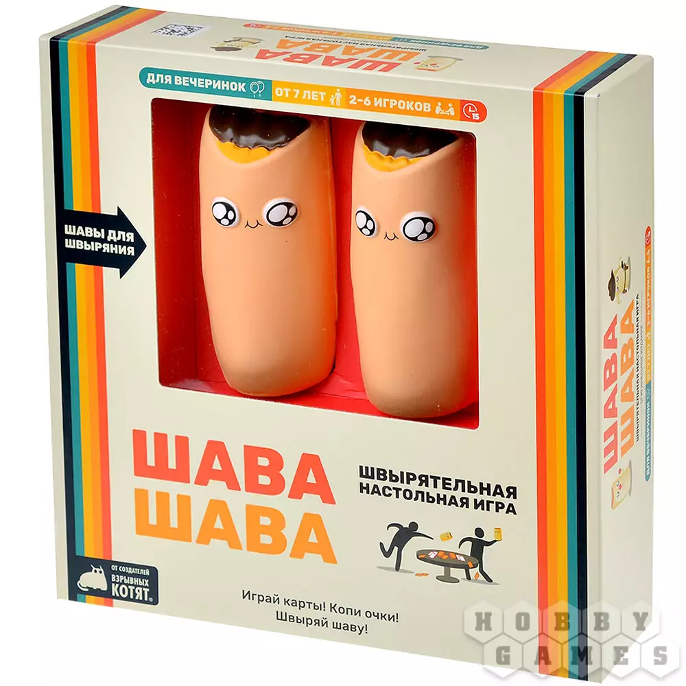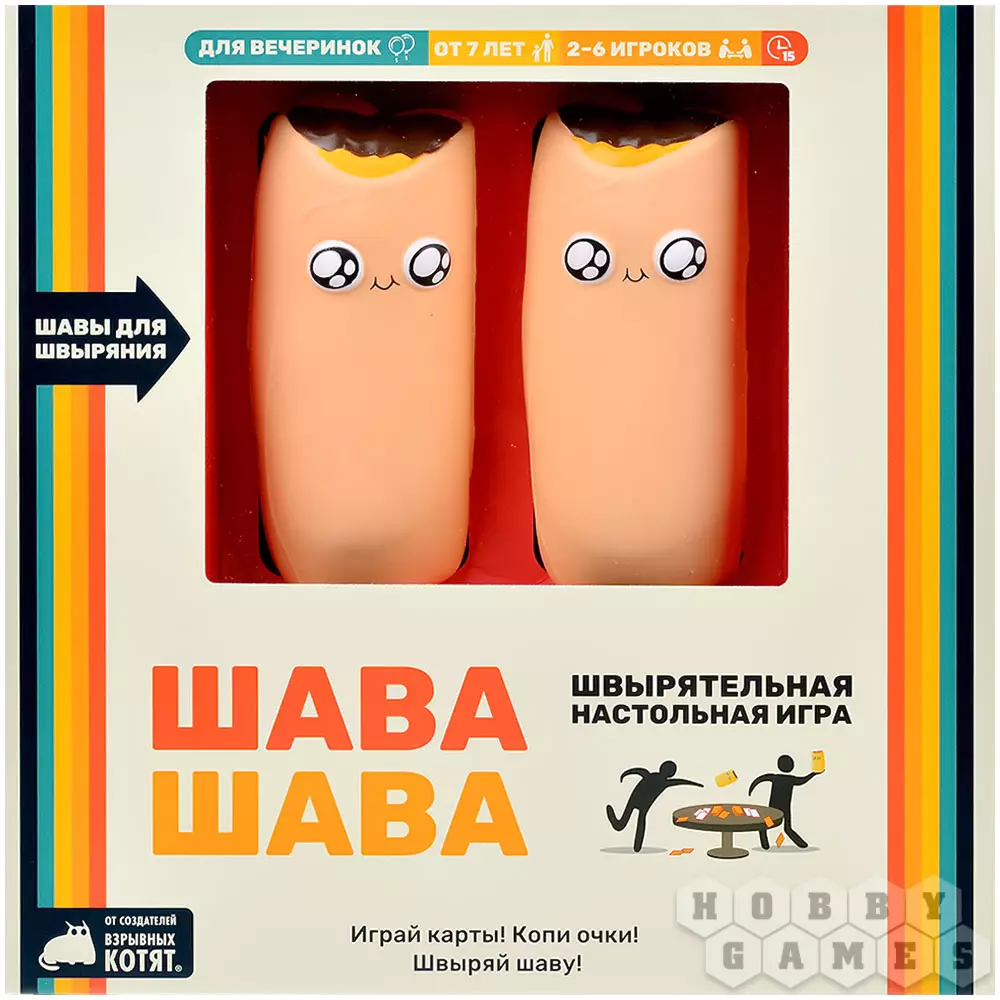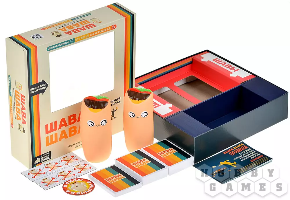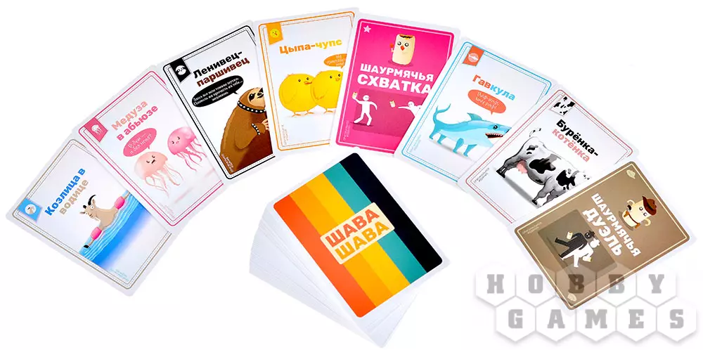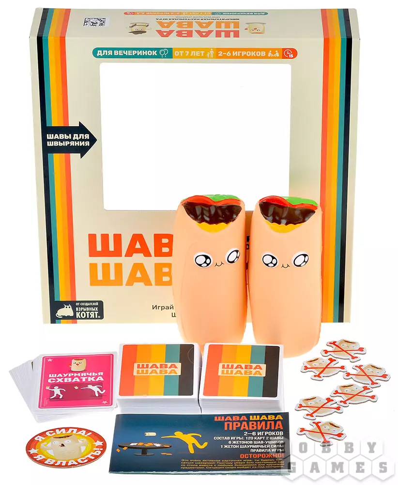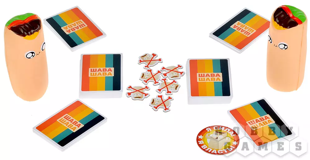 "Шава Шава" – это новая безумная настольная игра от авторов "Взрывных котят". В ней на протяжении двух раундов вам предстоит вербовать шаурменов, собирая наборы из трёх одинаковых карт – именно они будут приносить победные очки. Колода, откуда вам придётся тянуть карты, – это сброс игрока по соседству, поэтому не ждите хоть какого-то порядка в этом сумасшедшем хаосе! Игра бы не называлась "Шава Шава" будь в ней только карточки: в центре стола будут лежать 2 прекрасные мягкие шавы, которые только и ждут розыгрыша особых карт, чтобы полететь кому-нибудь в личико... Они в самом деле мягкие и ничего не пачкают, так что не нанесут вреда ни вам, ни вашей мебели (но лучше всё-таки не целиться в голову).
