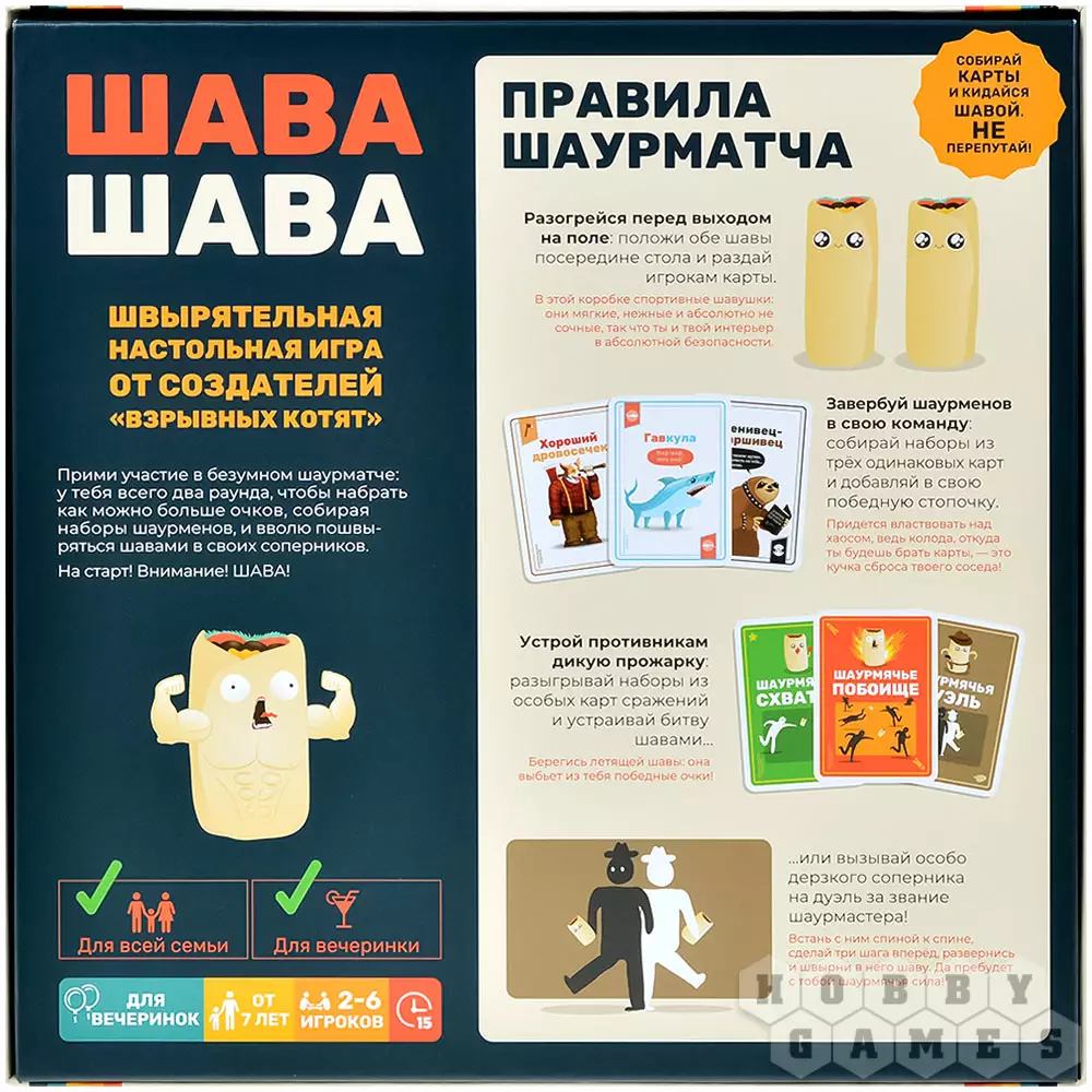 Приглашаем всех на сумасшедший шаурматч! Соберите лучших шав-поваров, шаурмастеров и всех-всех, кто знает, что делать с лавашом и мясом! "Ну и что же здесь такого особенного?" – могли вы подумать. А то, что в любой момент В ВАС МОЖЕТ ПРИЛЕТЕТЬ ШАВУХА! О да, придётся не просто карточки шлёпать, а ещё и уворачиваться. Ну либо не ждите, и запустите смачную шаву в соперника первыми!