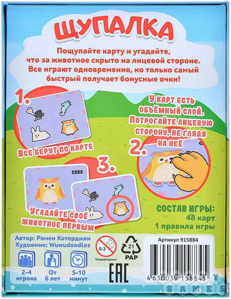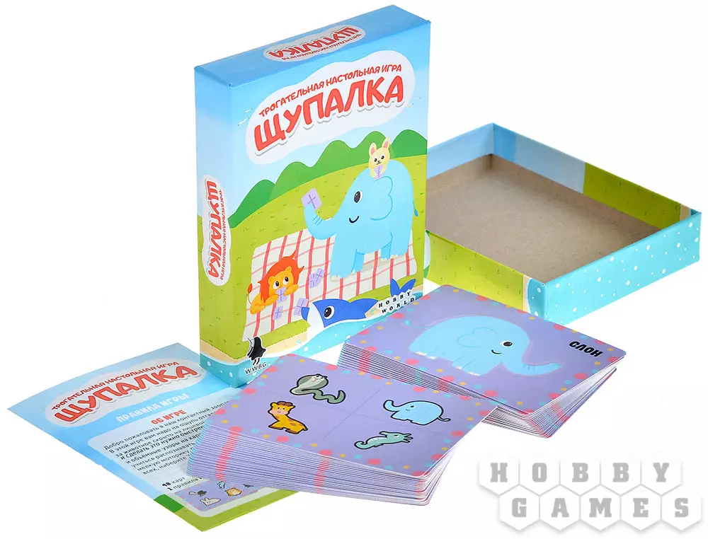 "Щупалка" – это очень трогательная карточная игра. В буквально смысле этого слова! На картах в игре есть объёмный слой, повторяющий форму животного. Сможете ли вы наощупь отгадать, какой зверёк попал в ваши руки? Смотреть на лицевую сторону карты нельзя, нужно полагаться только на свои тактильные ощущения. Будьте быстрее других игроков и получите бонусные очки!
