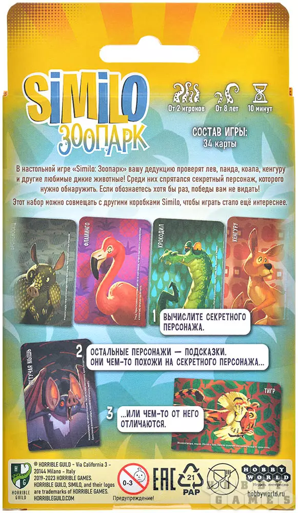 "Similo: Зоопарк" – это кооперативная игра, в ней вам нужно действовать совместно – вместе же вы выиграете или проиграете. Вы победите, когда на столе не останется ни одной карты, кроме секретной. Но если вы решите выкинуть её – вам тут же засчитается поражение.