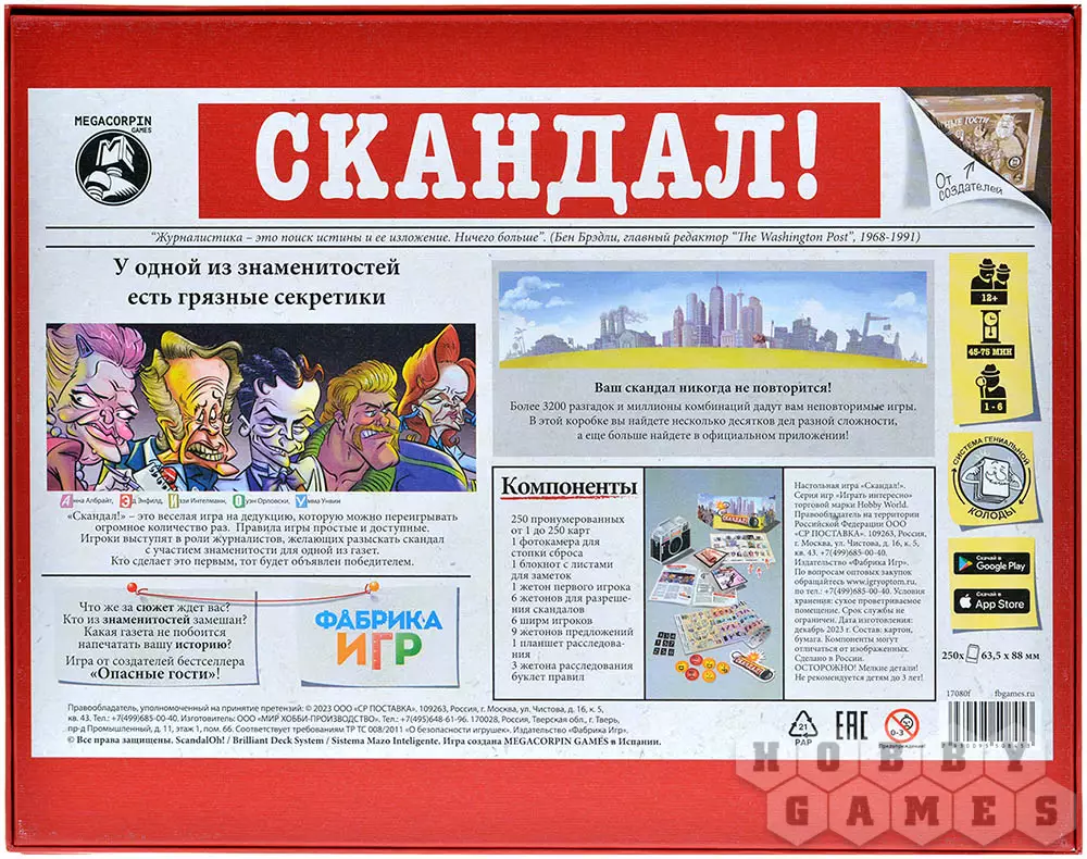 Приготовьтесь принять участие в журналистском расследовании в настольной карточной игре "Скандал"! Каждая новая игра предлагает абсолютно уникальные задачи, что достигается при помощи уникальной системы гениальной колоды: она обеспечивает множество сюжетов разных уровней сложности. Вы будете искать информацию о предстоящем деле, а чтобы из него получилась громкая сенсация, придётся задействовать дедукцию и логику.