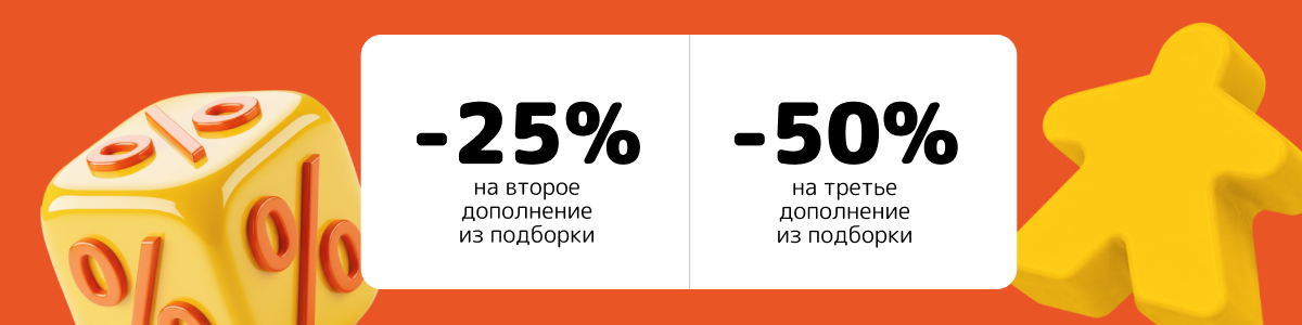 Любая великая игра – это только начало пути. Вы уже виртуозно владеете базовыми механиками и сыграли десятки партий? Самое время открыть для себя новые горизонты любимых вселенных, ведь у нас действует особое предложение на подборку дополнений: чем больше товаров в корзине, тем выше скидка!