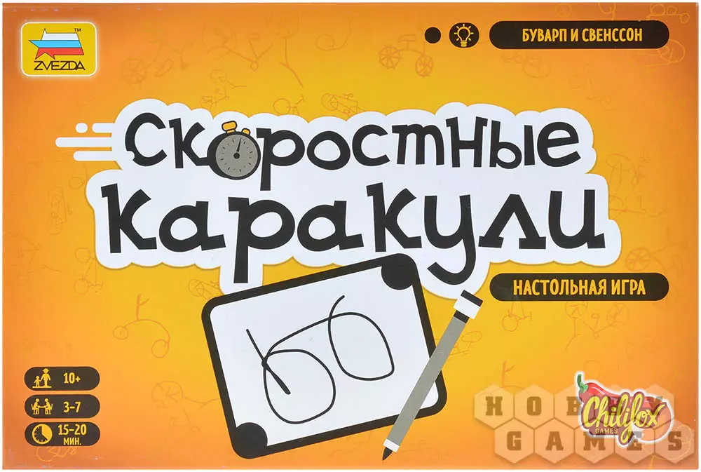 "Скоростные каракули" – весёлая настолка на ассоциации для шумной компании, в которой вам предстоит рисовать как можно быстрее! В этой игре качество рисунка не имеет значения, важна только скорость! А победить можно, даже нарисовав простую загогулину.