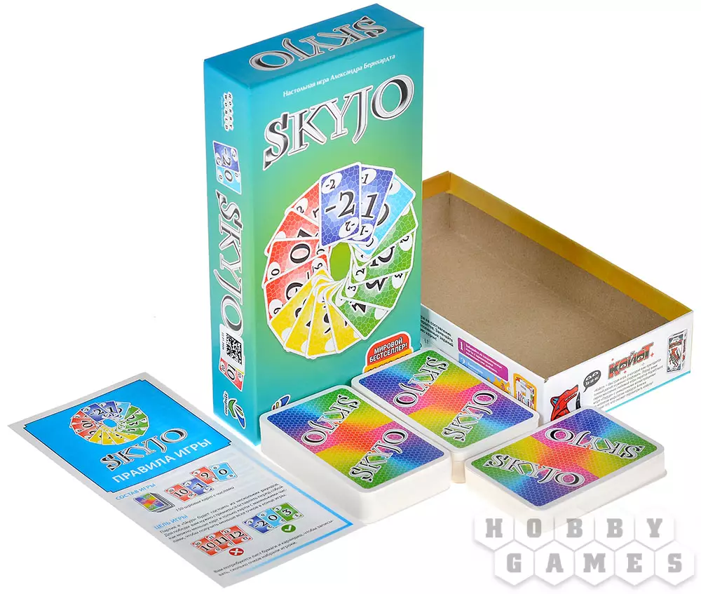 Skyjo – динамичная настольная карточная игра с простыми правилами, которые осваиваются буквально за минуту. При этом в игре удачно сочетаются расчёт и элемент удачи, поэтому она одинаково увлекает и тех, кто только знакомится с настолками, и более опытных игроков.