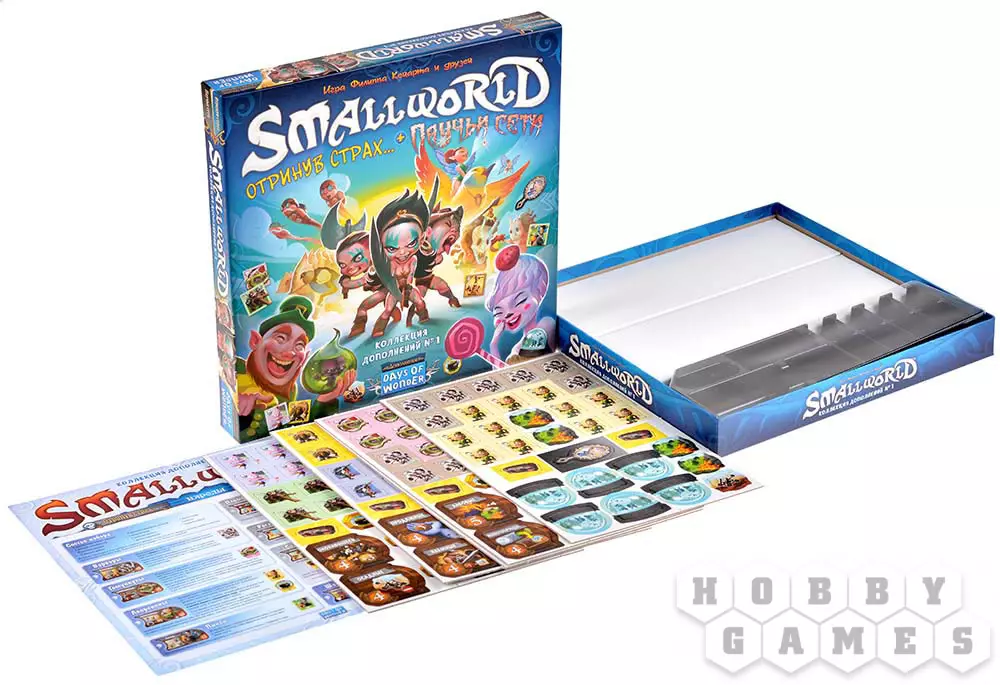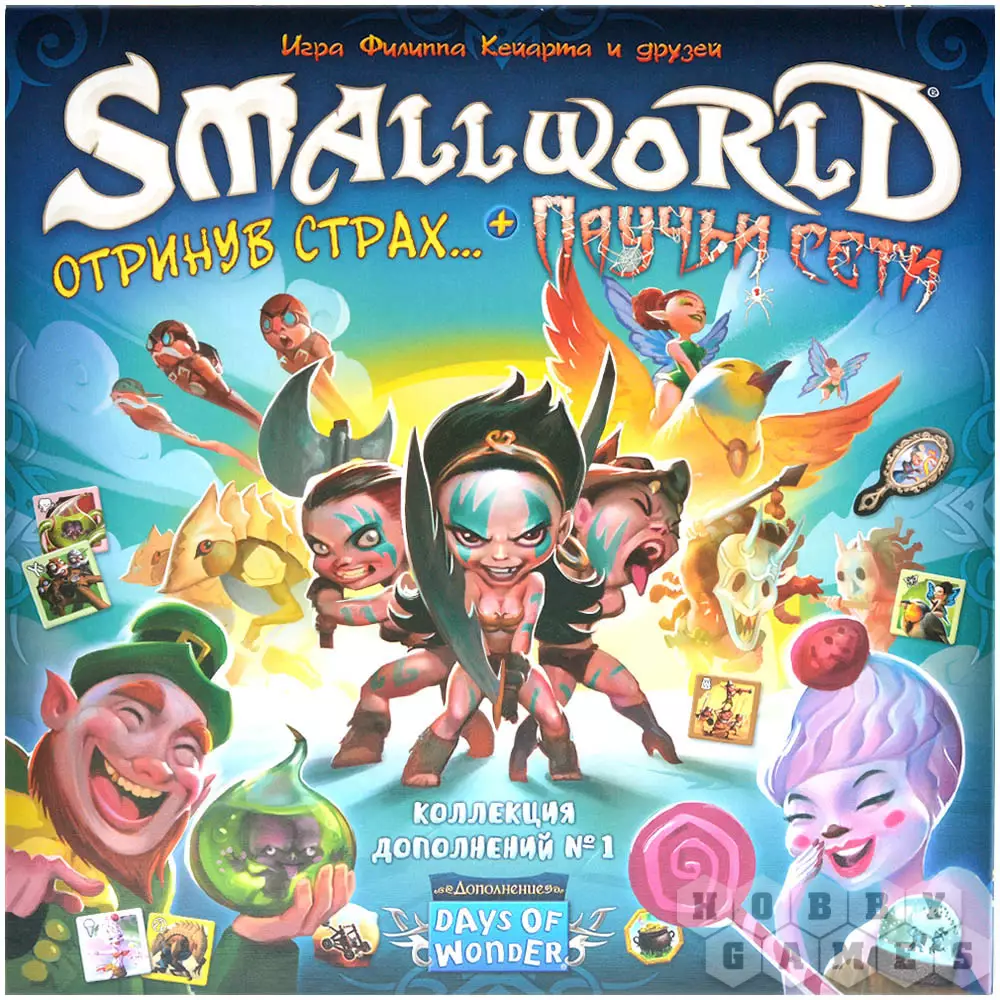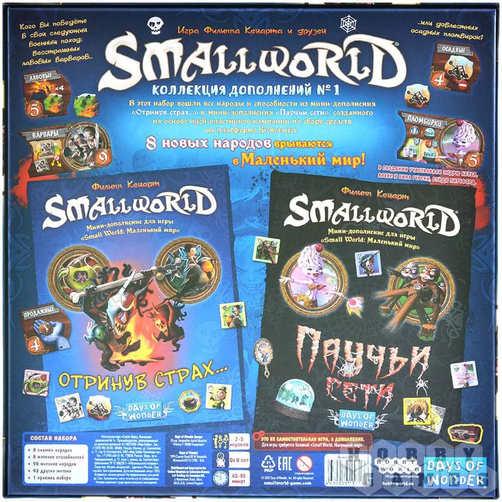 "Small World: Коллекция дополнений №1" – это набор, который объединил в себе 2 мини-дополнения: "Отринув страх..." и "Паучьи сети". Последний, кстати, был создан на основе идей нескольких участников компании по сбору средств на площадке Kickstarter. А кто, как не истинные фанаты знают, чем и как разнообразить любимую игру?