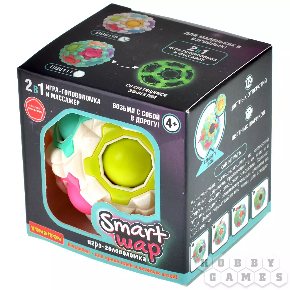 Игра-головоломка "Smart шар" – это хороший тренажёр для детей. Она хорошо развивает мелкую моторику, а также способствует пониманию цветов. Для решения головоломки нужно проталкивать маленькие выступающие шарики внутрь и в сторону, перемещая их в соседние отверстия и в итоге довести до отверстий соответствующих им цветов.
