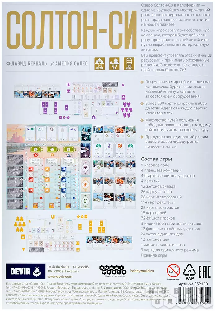 "Солтон-Си" – это стратегическая настольная игра, в которой вы возглавите компанию по добыче рапы, переработке её в литий и выработке геотермальной энергии. Вас ждёт управление ограниченными ресурсами, продуманное планирование и рискованные решения, от которых зависит успех всей компании.