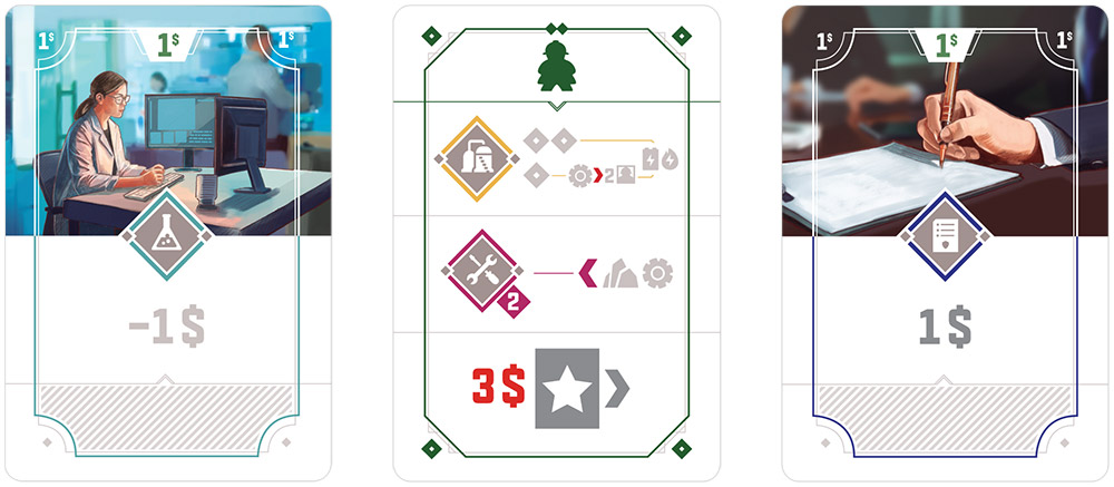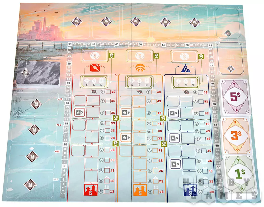 Развитие: Двигайте индикатор развития бизнеса, чтобы открывать новые ячейки склада (переворачивая жетоны склада) и нанимать дополнительных инженеров.