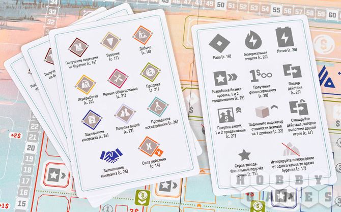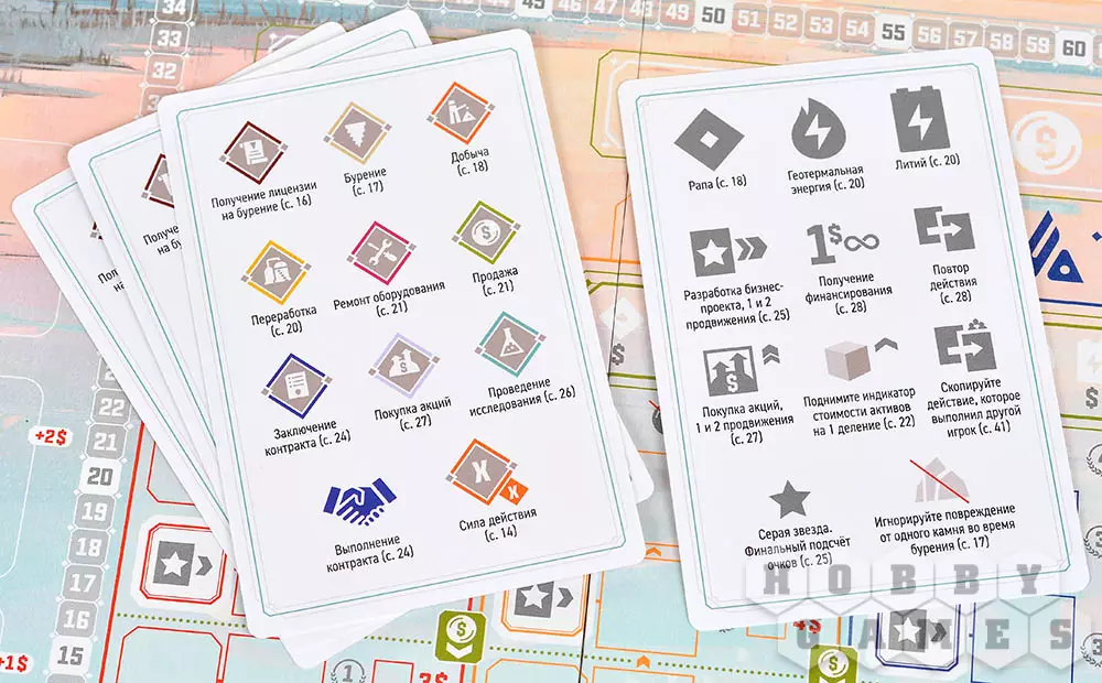Бурение: Продвигайте фишку бура по картам участков, чтобы добраться до рапы. Встреча с каменными слоями сдвигает индикатор повреждения бура – при критическом износе бур заклинивает.