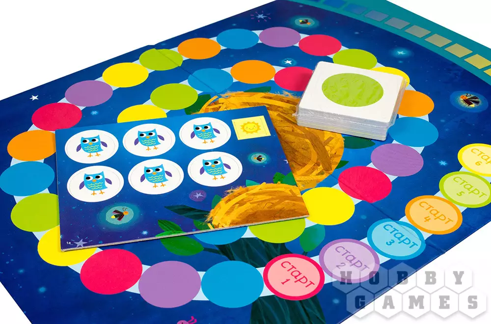 Игровое поле состоит за разноцветных кружков. Каждый ход участники смогут сыграть карту любого цвета. После этого можно передвинуть любую птичку на следующее для неё свободное поле этого цвета, при этом занятые поля нужного цвета совушки пролетают насквозь.