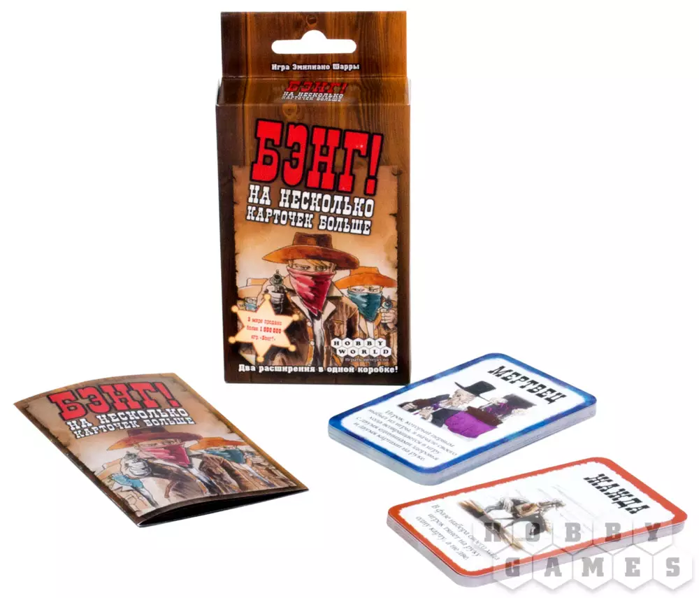 "Бэнг! На несколько карточек больше" – это небольшое дополнение для культовой настольной игры "Бэнг!". Теперь ковбои подвержены новым независимым событиям, которые уж точно повлияют на ход всей партии! Мёртвые восстают из могил, в город прибывает поезд, неупокоенные духи бродят по улицам, а в салунах играют в русскую рулетку.