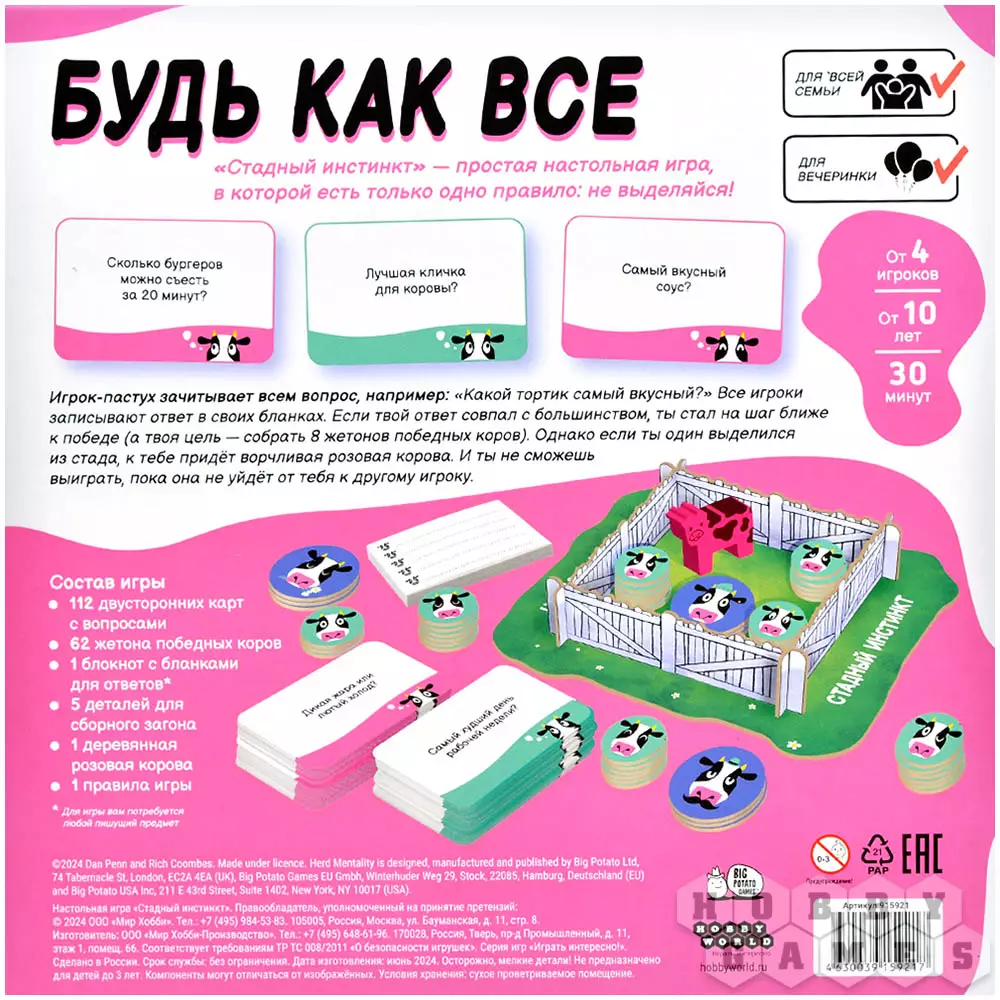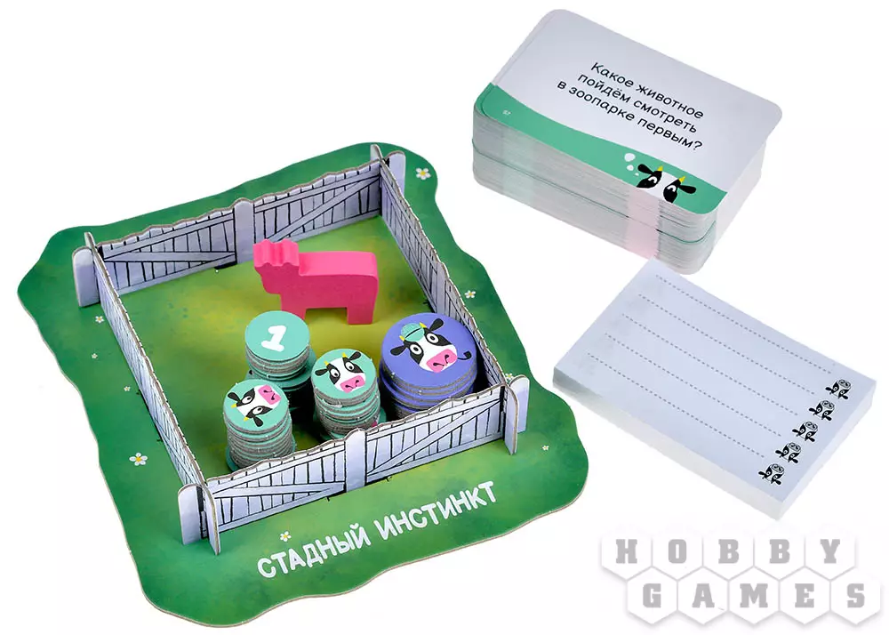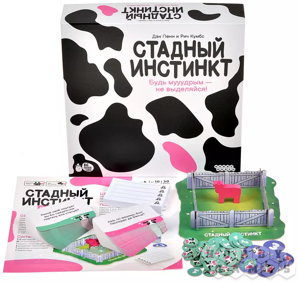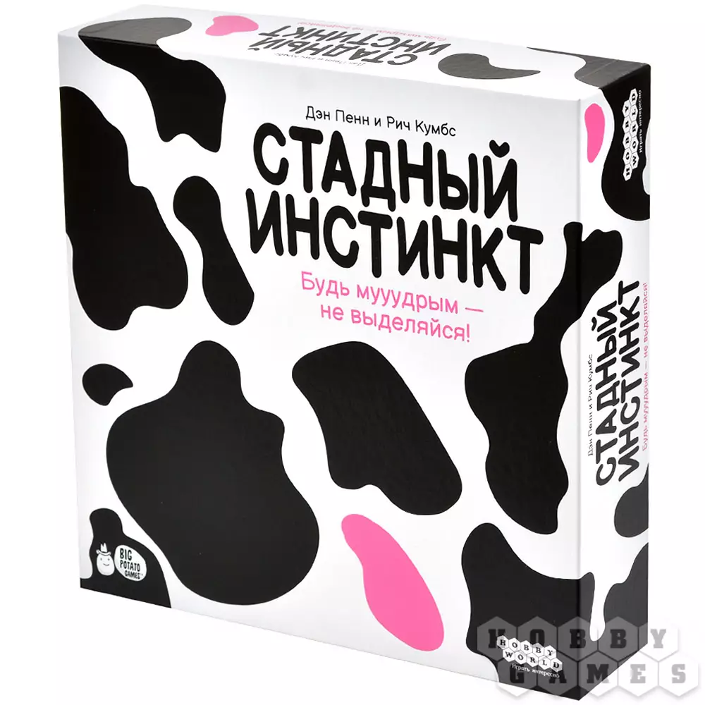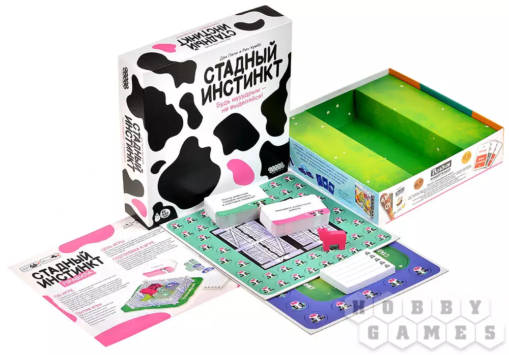 "Стадный инстинкт" – это простая настольная игра, где вам придётся отвечать на вопросы, которые задаёт пастух, не так, как вам, возможно, хотелось бы ответить, а так, как ответило бы большинство из собравшихся за игровым столом. Вам придётся активировать своё умение мимикрировать (или очень-очень быстро его приобрести) и читать других людей, чтобы победить. А если вдруг ваша индивидуальность всё же прорвётся через заслон стадного инстинкта, что ж, – ждите в гости розовую ворчливую корову, которая будет му-учить вас до тех пор, пока вы не сможете вновь отправить её в свободное плавание!