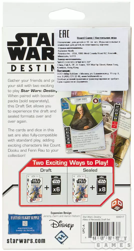 Как и в случае с Rivals до этого, игрокам просто нужен набор Allies of Necessity и шесть бустеров Star Wars: Destiny, чтобы участвовать в каждом драфте или закрытом событии! Более того, карты в вашем драфтовом наборе Allies of Necessity можно использовать повторно – независимо от того, сколько драфтов вы играете, вам нужен будет только один набор, чтобы включить ваши драфты в Star Wars: Destiny!