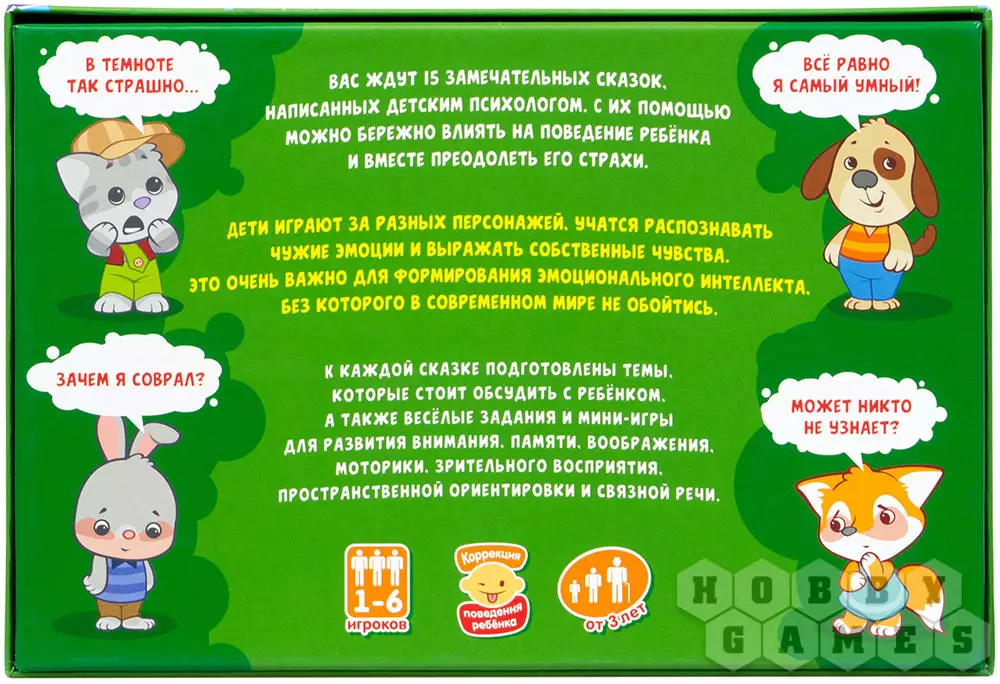 Основная "изюминка" этой игры – терапевтические сказки. Они написаны Еленой Михайлиной – детским психологом и арт-терапевтом. Основную идею игры и задания к сказкам придумала учитель-логопед Елена Круглова. Каждая из пятнадцати сказок, представленных в красочном буклете с правилами игры, затрагивает отдельную тему в воспитании ребёнка. Малыш узнает о страхах темноты, высоты или громких звуков, поймёт, зачем убираться, почему врать нехорошо, а вестись на "слабо" – глупо, и о многом другом.