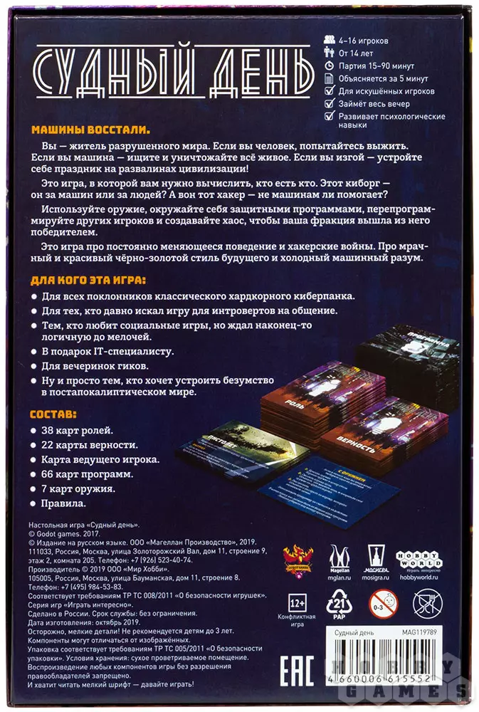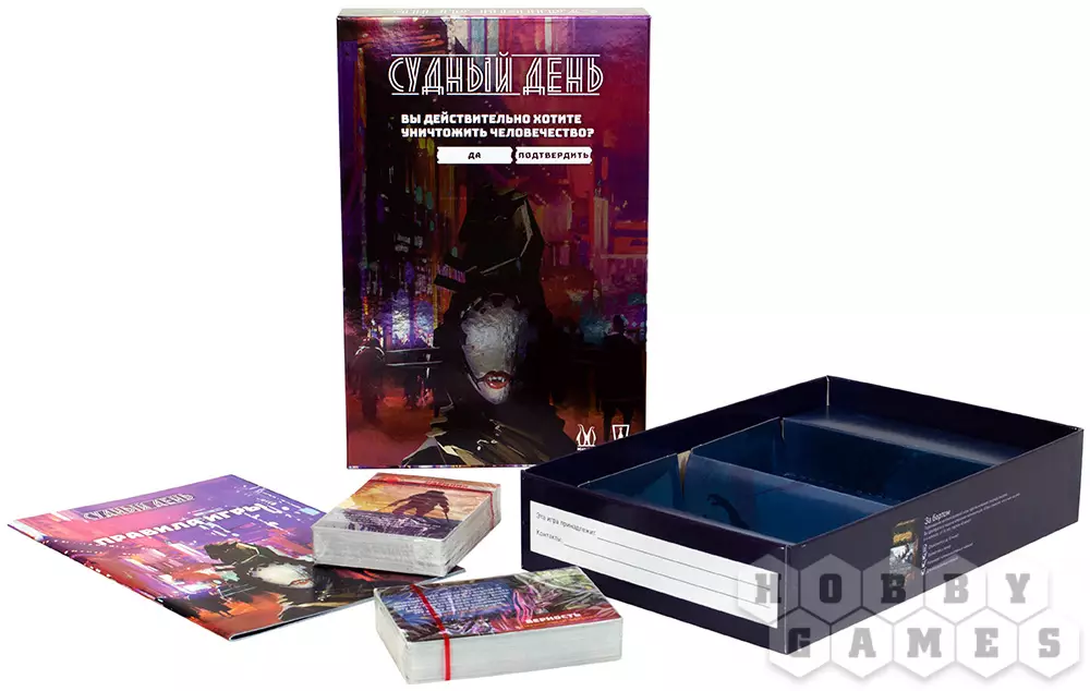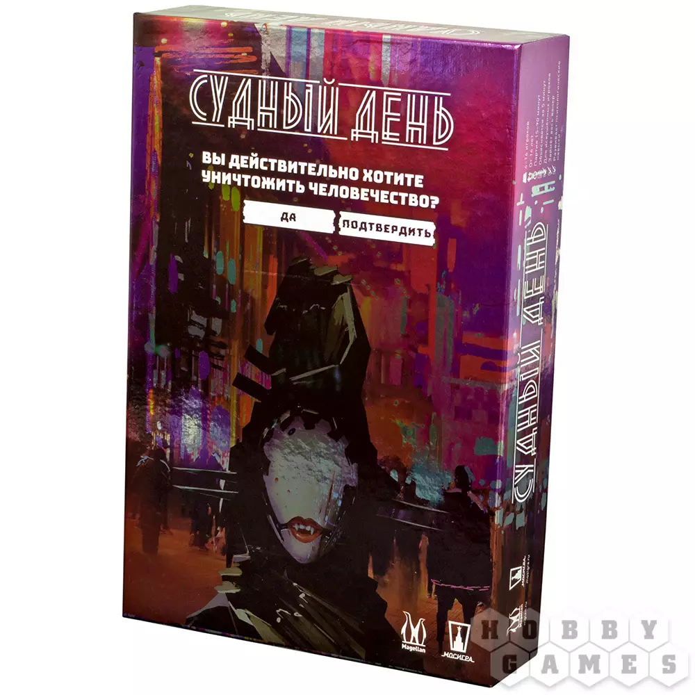 В настольной игре "Судный день" вам достаётся роль выживших людей, машин или изгоев. Люди пытаются выжить, машины уничтожают всё живое, а изгои пытаются обустроиться в новом мире. "Судный день" – это невероятная комбинация вечериночной игры с дедукцией и социальным экспериментом. Игрокам предстоит выяснить, кто есть кто и кто на чьей стороне, взять в руки оружие и уничтожить врагов. Сосредоточьтесь, возможно среди вас враги!