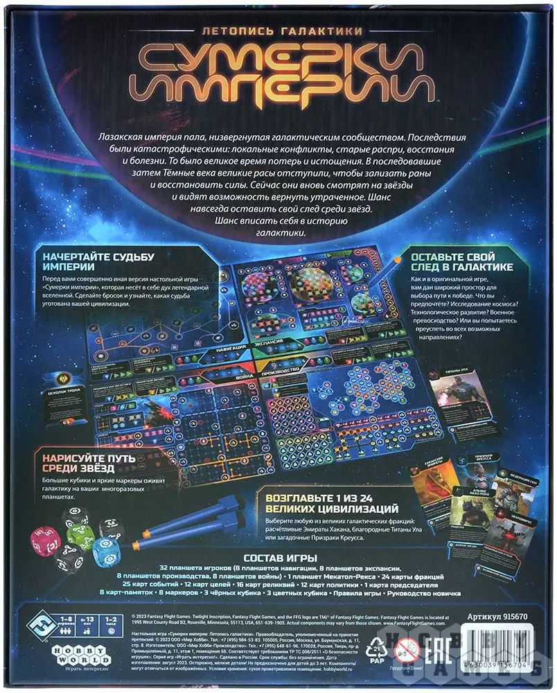 "Летопись галактики" – это абсолютно иная версия настольного гиганта "Сумерки империи", которая также несёт в себе дух огромной вселенной. Ровно как в оригинале у вас будет большой простор для развития и выбора собственного пути к победе! Решите ли вы отправиться на исследование космоса или вложите свои ресурсы в технологическое развитие? А может, вам по душе решение вопросов грубой силой? Тогда военное превосходство – ваш вектор развития. Но ничего не мешает вам вести свою цивилизацию ко всестороннему развитию. Кстати о цивилизациях, в игре на выбор их представлено целых 24! Выбирайте любую и ведите её к процветанию!