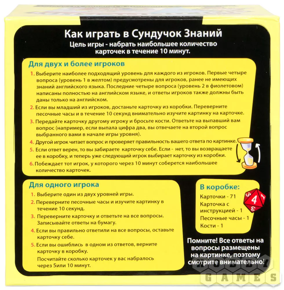 Серия настольных игр "Сундучок знаний" рассчитана на обучение детей в весёлой игровой форме. Эти игры развивают внимательность и наблюдательность, предлагая участникам изучить картинку в течение десяти секунд, а потом ответить на определённый вопрос. Каждая коробочка с игрой содержит несколько десятков карточек, объединённых одной тематикой. Таким образом, ребёнок, изучая карточки, усваивает полезную информацию по тому или иному предмету и узнаёт много нового и интересного.