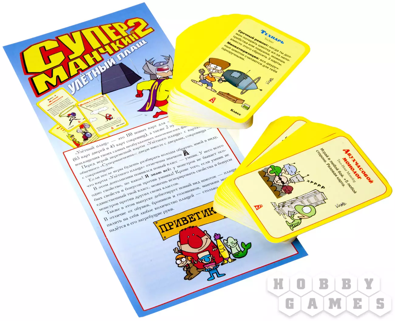 "Улётный плащ" предлагает вам 110 новых карт для "Суперманчкина", а конкретнее – 65 карт дверей и 45 карт сокровищ. Среди больших новинок – новый класс Умник. У него всего одно свойство, но очень приятное: у монстров не бывает особых свойств или бонусов против Умников! Также дополнение привносит новый вид Шмоток – плащи. А так как мы настоящие манчкины, то плащей сможем напялить на себя сколько угодно много…