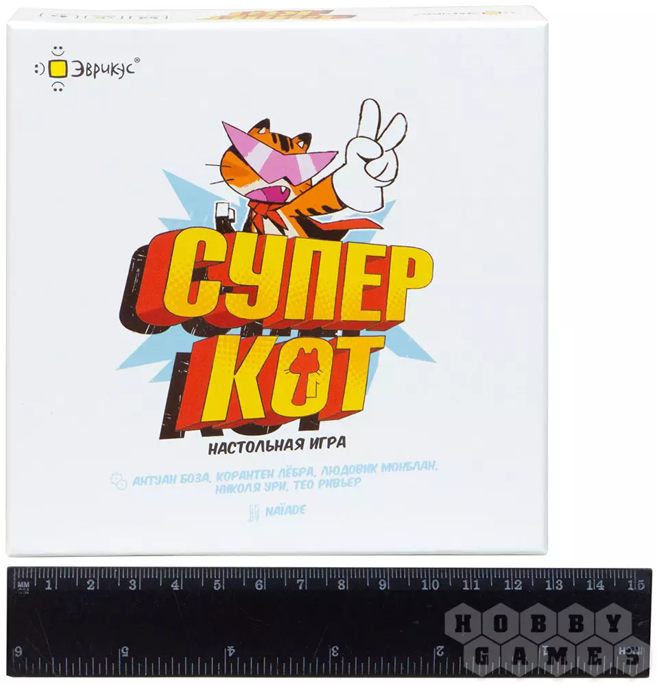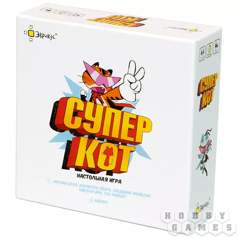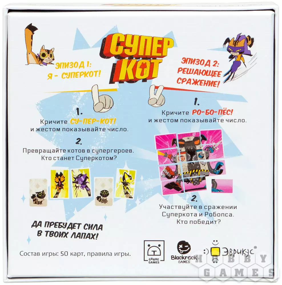 В настольной игре "Суперкот" вы играете за одну из враждующих сторон – Суперкота или Робопса. Игровой процесс состоит из двух эпизодов. В первом эпизоде каждый из игроков пытается перевоплотить пять своих обычных котов в супергероев. Для этого участники громко повторяют "Су-пер-кот" и одновременно показывают пальцами число от ноля до пяти. Тот, кто показал самое большое число, которое, к тому же, не повторяется с кем-то из игроков, выигрывает в этом раунде и перевоплощает одного или даже двух своих котов, в зависимости от показанного числа. Как только у одного из участников появляется пять супергероев, он становится мощным Суперкотом и готов лицом к лицу встретиться с гигантским Робопсом, на чью сторону встают все остальные игроки.