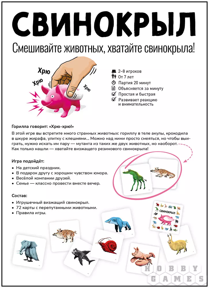 "Свинокрыл" – это весёлая игра для большой компании, которая идеально подойдёт для вечеринки. Простые правила не заставят вас ломать голову, а игровой процесс бросит серьёзный вызов внимательности, скорости реакции и умению не слишком много смеяться.