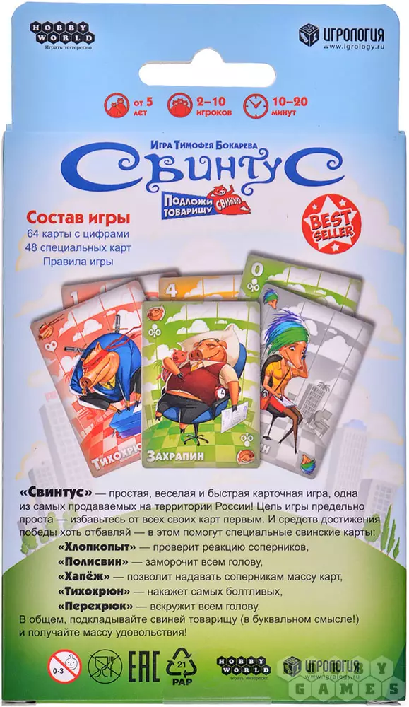 Специальные карты составляют одну из главных изюминок игры. Другая же заключается в нескольких "острых" правилах: правиле Свинтуса, перехвата и перевода карт! Вместе они подарят вам незабываемые впечатления от этой игры. Испытайте чистую свинячью радость!