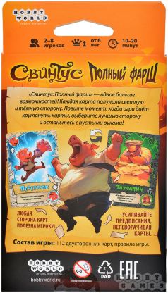 "Свинтус: Полный фарш" сохраняет дух оригинала, но добавляют крутой вираж: нужно быстрее всех избавиться от карт, используя их двойную природу. Ваша стратегия будет заключаться в том, чтобы чувствовать момент, когда переворот карты принесёт максимальный эффект и оставит соперников в растерянности.