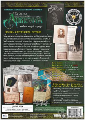 "Тайны Аркхэма" – это приключенческая детективная игра, в которой игроки, объединяя свои способности к детективному ремеслу, расследуют странные события в восьми сценариях (чем дальше, тем сложнее дело). Вы будете вести дела независимо от Армитеджа, а в конце сможете сравнить свои успехи, ответив на ряд вопросов. Чем лучше справится ваша команда, тем выше будет победный счёт!