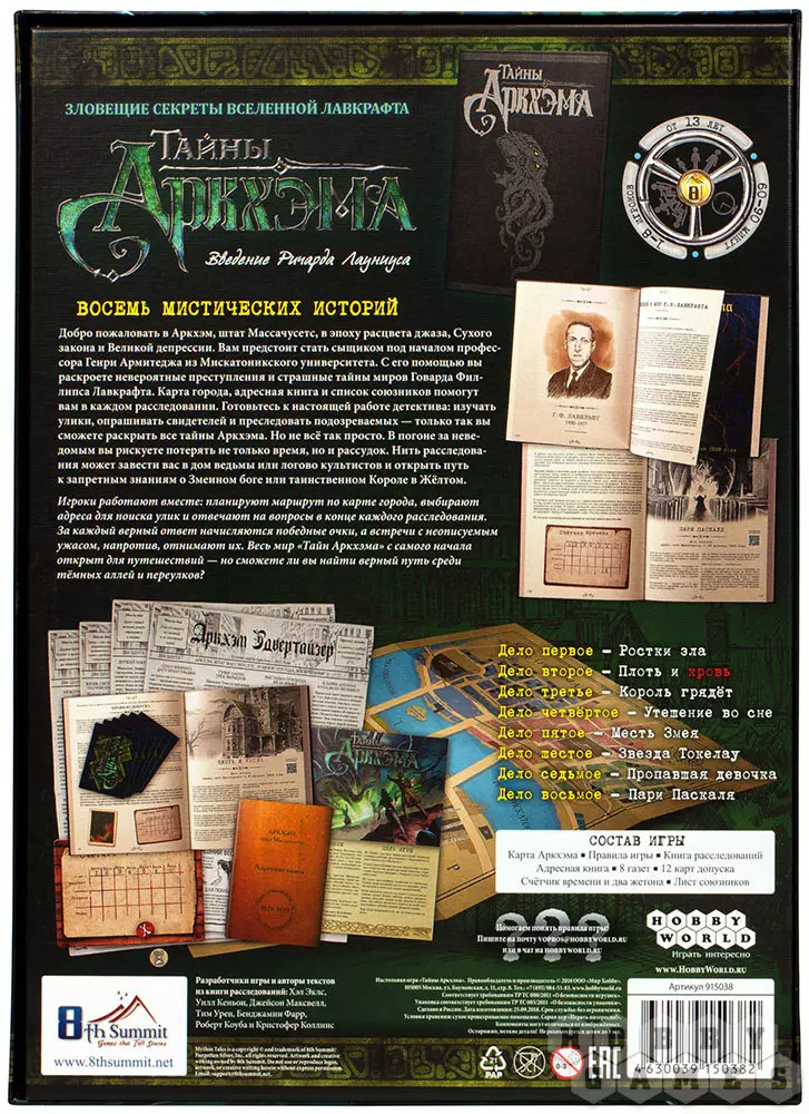 Корольков09.10.2020 11:13Отличная игра, даже в отрыве от рассказов Лавкрафта. Если же вы фанат творчества писателя, то игра вам понравится 100%, знакомые герои, враги, монстры и события не оставят равнодушным. Сама игра чисто детективная. Никаких кубиков, полосок здоровья, и прочего, что так любит серия Аркхем. В игре всего 8 дел, и если первые кажутся слишком легкими и примитивными, то уже третье дело начинает заводить в тупик и приводить к неверным действиям и выводам. По большей части проиграть в игре нельзя, можно лишь не достаточно точно ответить на финальные вопросы, но осадок точно останется. Самые прсотые рекомендации перед началом игры, это обзавестись блокнотом в котором все тщательно записывать. Показания свидетелей, выводы экспертов, заметки и мысли. И самое главное... имена) Играть можно как одному так и в компании и если относится к правилам честно и не" подглядывать", то вы точно ощутите себя настоящим сыщиком в Америке 30-ых годов!