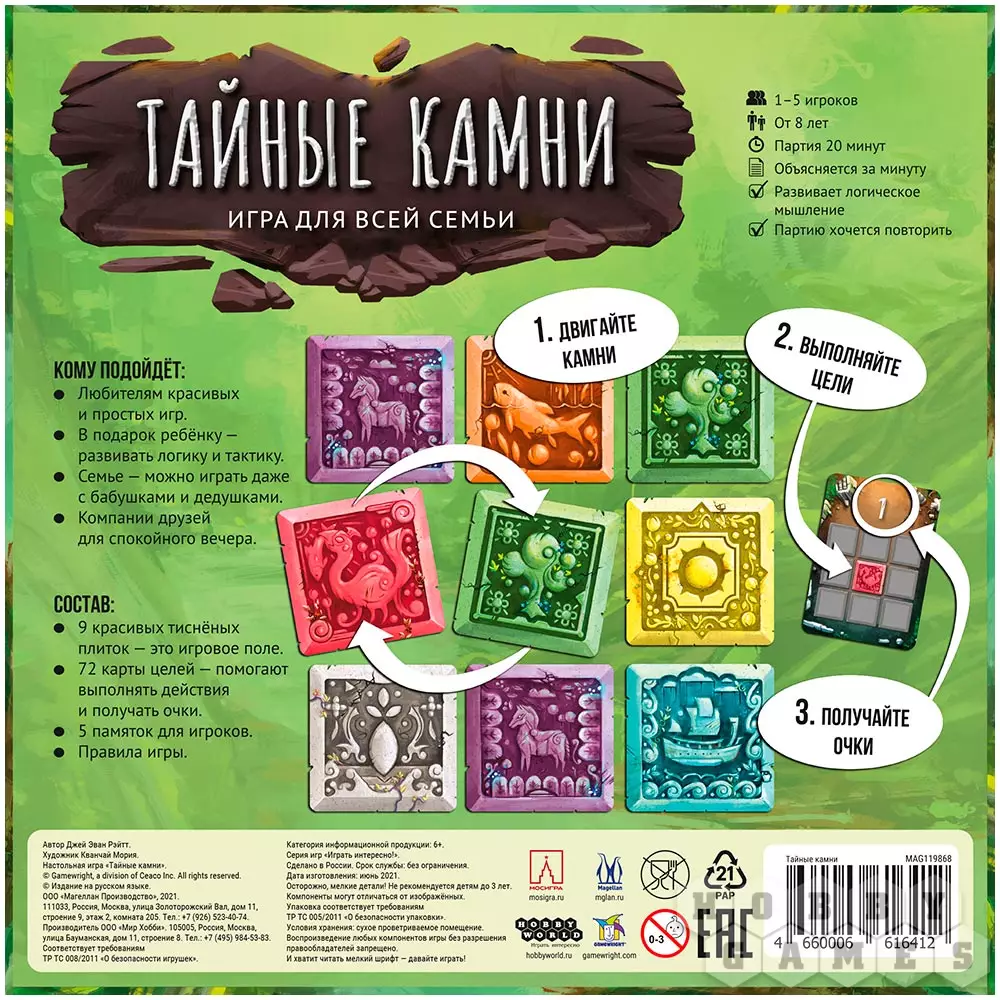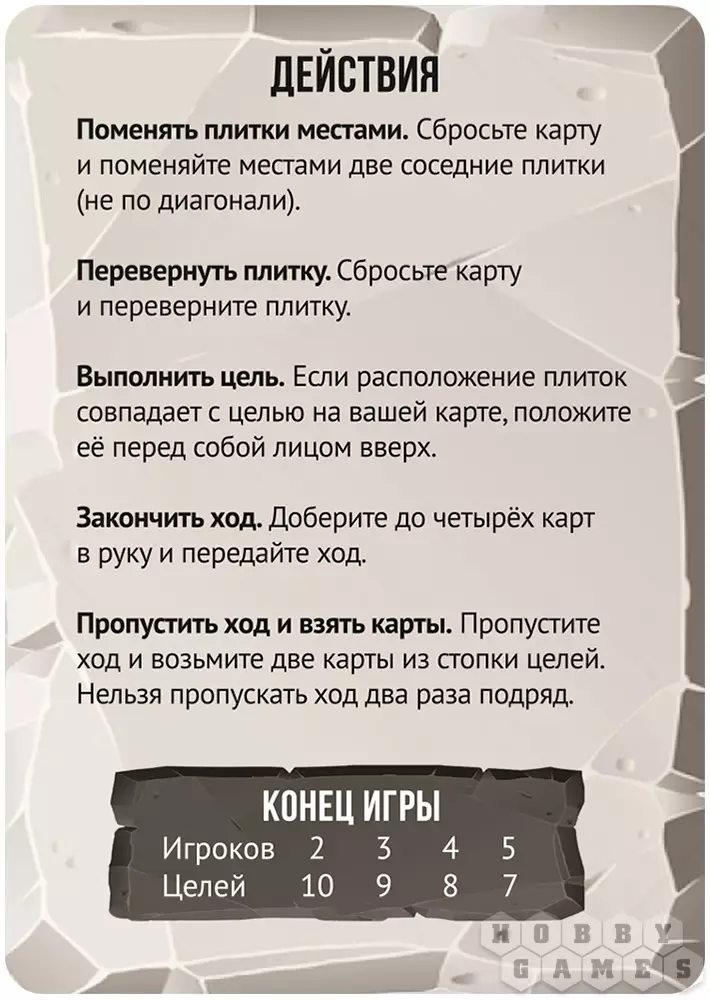 Потный батя07.09.2022 09:50Отличная игра! Правила элементарные, захватывает с первой минуты. Партия на двух игроков занимает минут 10-15, лично мы не заметили, как провели за игрой два часа! Игровые плитки приятно держать в руках а наличие 72 игровых карточек с заданиями создают большую реиграбельность. Рекомендую всем, подойдет и для приятной дуэльной игры, так и для компании 5 человек, даже есть вариант соло-игры, за это отдельный плюс.