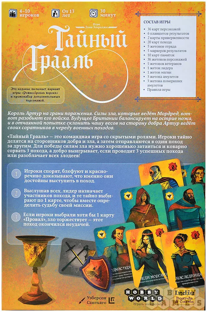 "Тайный Грааль" – это командная игра со скрытыми ролями. Участники тайно разделяются на приверженцев добра и зла, после чего отправляются в череду походов. Чтобы одержать победу, силы зла должны скрытно действовать и саботировать 3 похода, тогда как добро побеждает, успешно завершив их, или раскрыв всех злодеев.