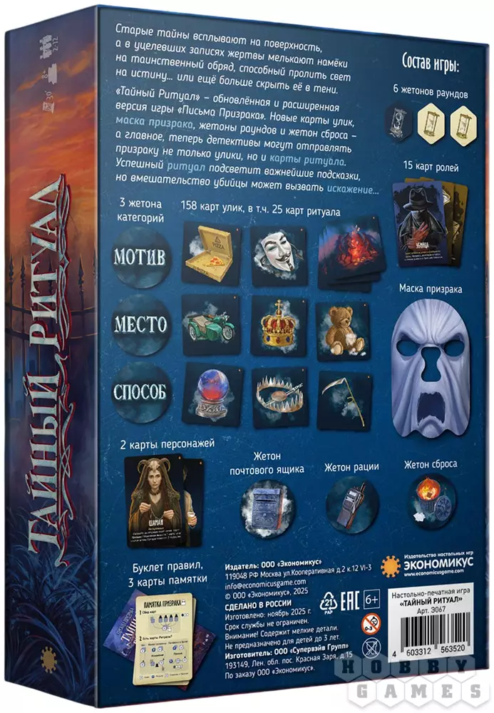 "Тайный Ритуал" – это обновлённая и расширенная версия знаменитых "Писем Призрака", ставшая ещё глубже и атмосфернее. Вас ждёт мистическое детективное расследование, где среди участников могут скрываться не только союзники, но и предатель (или даже предатели). Один из игроков возьмёт на себя невероятно важную роль Призрака жертвы, остальные же станут Детективами (а если вы выбрали сыграть в продвинутый режим, то вам также предстоит стать Убийцей или его Сообщником). С помощью магического почтового ящика детективы будут пытаться получить от духа подсказки о совершённом преступлении, ведь он единственный, кто знает истину, – и, как назло, единственный, кто не может говорить. Ваша цель – докопаться до сути, вычислив три истинные улики: мотив, место и способ преступления.
