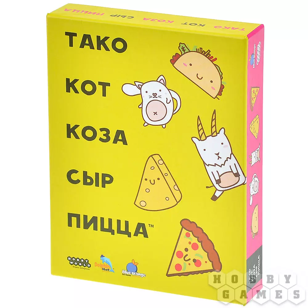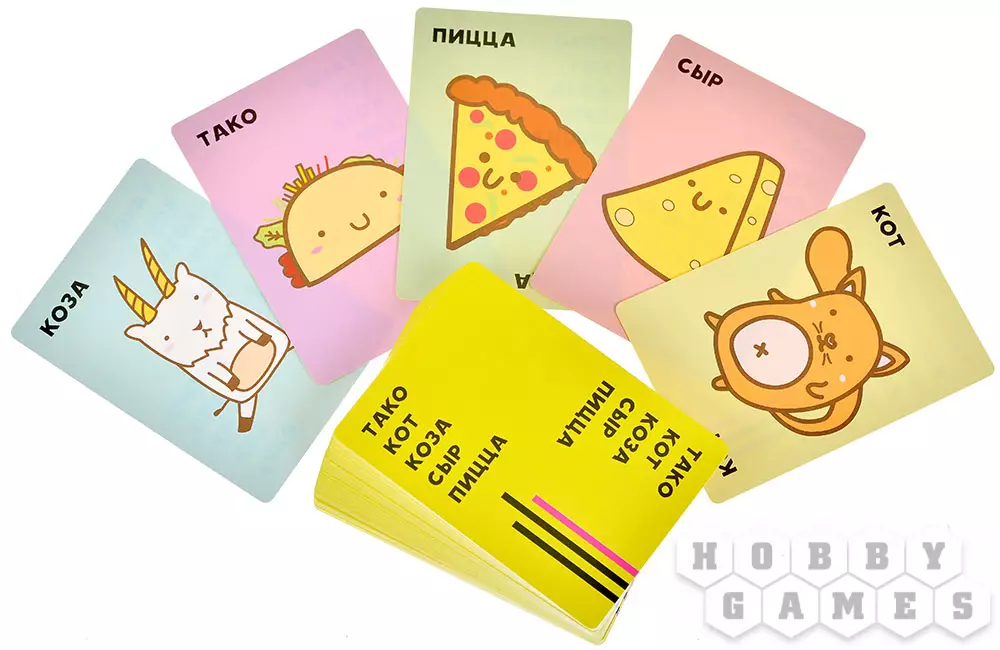 В этой игре вам придется выкладывать на стол карты, произнося вслух слова "тако, кот, коза, сыр, пицца", вне зависимости от того, что будет изображено и написано на картах. А также нужно будет делать определенные действия, если в игре появились особые карты: горилла, сурок или нарвал.