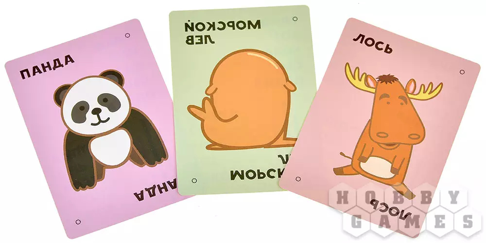 Что же нового принесла нам именно эта коробка? Тут вы не найдёте, как в прошлый раз, сурка, гориллу и рогатого нарвала. Вместо них в колоде с картами притаились новые герои: панда, лось и морской лев! В тот момент, когда открывается карта с таким персонажем, нужно перед тем, как накрыть колоду, сделать определённый жест руками, например, погладить себя по животу, изобразить рога над головой или хлопнуть два раза в ладоши.