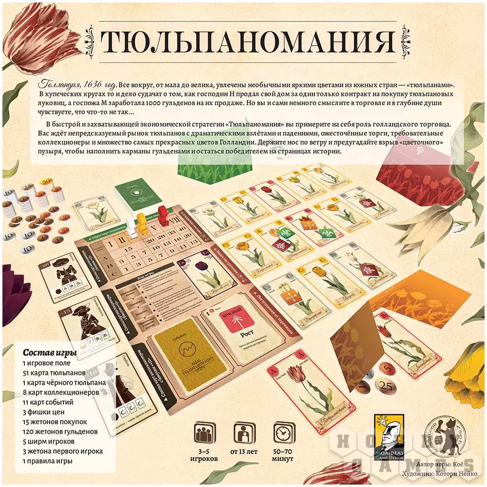 "Тюльпаномания" – это захватывающая экономическая стратегия, предлагающая вам стать участниками тюльпановых торгов. Непредсказуемые падения рынка заставят понервничать даже настоящих экономистов, а неожиданные взлёты подарят возможность быстро набить свой карман. Но достаточно ли у вас выдержки, чтобы дождаться подходящего момента? Требовательные покупатели, жестокие торги и масса самых прекрасных цветов с просторов Голландии – вот что ждёт вас в этой игре. И помните главное: люди не покупают тюльпаны, людям продают тюльпаны!