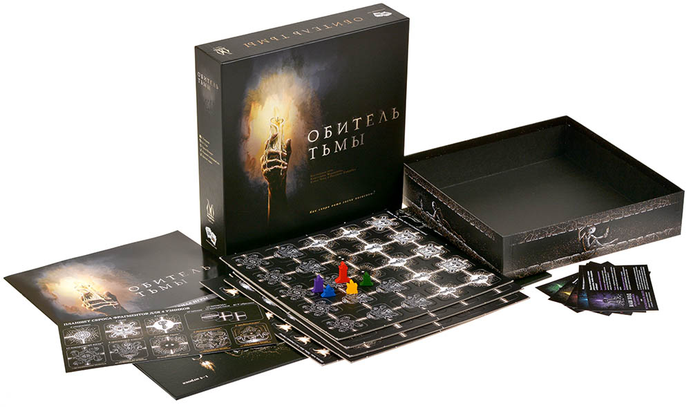 "Обитель тьмы" – атмосферная кооперативная игра, в которой участники блуждают по тёмному лабиринту, освещая путь лишь небольшим количеством света. Карта формируется по ходу партии и постоянно меняется, заставляя игроков теряться и сомневаться в своих ориентирах.