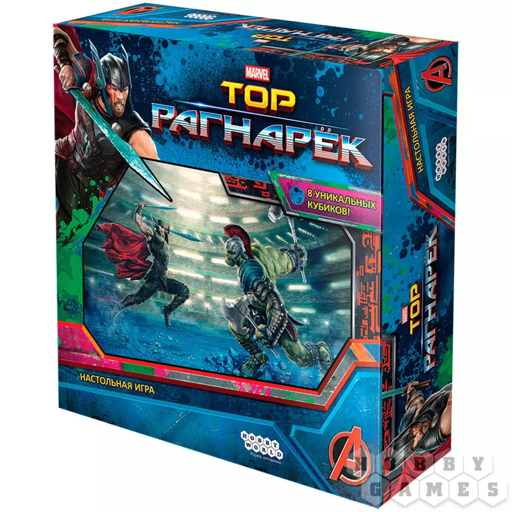 "Тор. Рагнарёк" – это весёлая и динамичная игра, механика которой построена на бросках кубиков. Действие игры происходит во вселенной Марвел, поэтому вы встретите знакомых персонажей. Вам предстоит соревноваться в броске молота Тора – могучем Мьёлнире. Для этого необходима уверенная и удачливая рука, так как успешность броска зависит от выпавшего результата на кубиках. Чтобы улучшить бросок, вы можете использовать помощь других героев, то есть специальные карты Валькирии, Халка и Тора. С каждым раундом к броскам добавляются кубики, накал страстей возрастает, а молот забрасывается всё дальше и дальше. Также игра предлагает специальные правила для более опытных игроков.