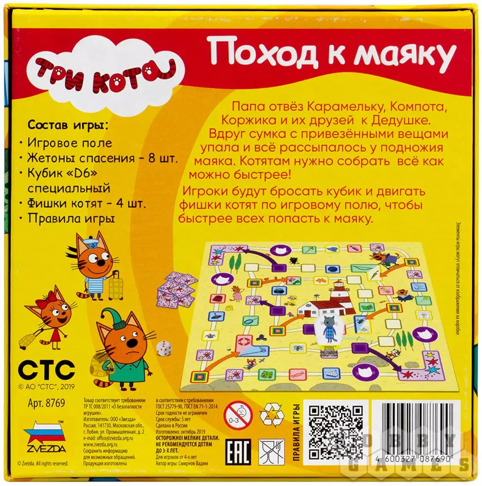 В настольной игре "Три кота. Поход к маяку" вещи котят оказались разбросаны у подножия маяка. Котята решили объединить полезное занятие с игрой. Так вещи стали сокровищами, а котята отважными исследователями. Бросайте кубик, передвигайте персонажей и соберите их все.