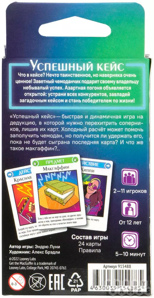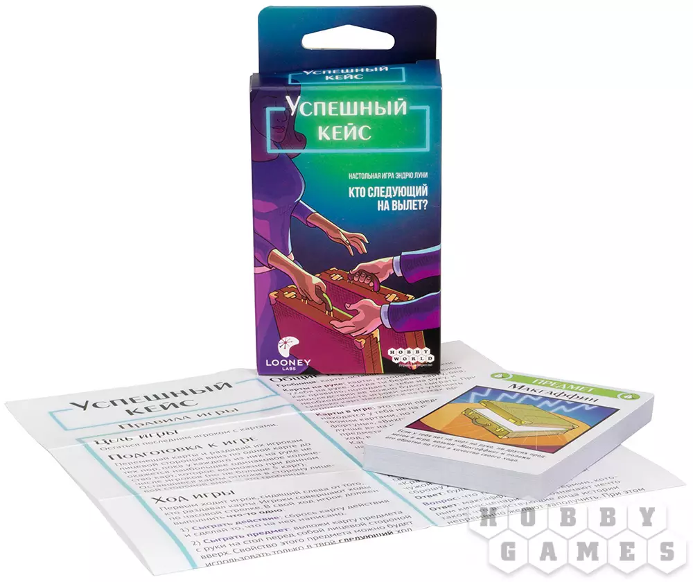 Динамичная карточная настольная игра "Успешный кейс" проверит ваш уровень дедукции и хитрости. В компании от 2 до 11 человек вы сойдётесь в молниеносном противостоянии за заветный чемоданчик. Планируйте неожиданные ходы, чтобы ввести противников в заблуждение и лишить их всех карт. Сможете ли вы завладеть макгаффином и удержать его, пока не будет выложена последняя карта? Только ясный ум и холодный расчёт приведёт вас к победе!
