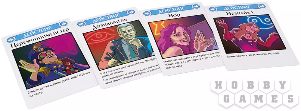 Сыграть действие: выложите карту действия и выполните предписания карты, после этого карта сбрасывается