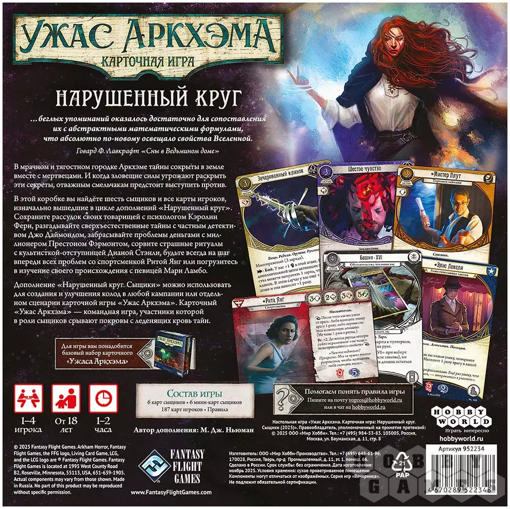 Коробка "Нарушенный круг. Сыщики" включает в себя 6 сыщиков и все карты игроков, которые ранее выпускались в составе отдельных наборов цикла "Нарушенный круг". Попробуйте разгадать сверхъестественные тайны вместе с частным детективом по имени Джо Даймонд. Со спортсменкой Ритой Янг вы будете оказываться на шаг впереди любой проблемы. Но если проблемы всё-таки одолеют, решить их помогут деньги, а с деньгами поможет миллионер Престон Фэрмонт. Постарайтесь не потерять рассудок и помогите сохранить его вашим товарищам вместе с психологом Кэролиной Ферн. Свой человек в рядах культистов – отступница Диана Стэнли – поможет вам сорвать ужасные ритуалы. А вместе с певицей Мари Ламбо изучите собственное происхождение. Что бы в Аркхэме ни происходило, в центре событий всегда окажутся смелые сыщики. Ваша задача, как и всегда, не дать им сойти с ума.