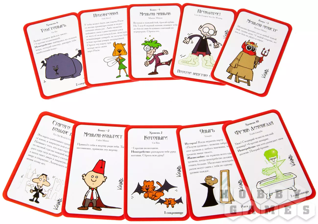 Итак, настольная игра "Манчкин" – это ролевая игра по форме, пародия по содержанию. Манчкины игроков ходят по подземелью, вытаскивают на свет божий тамошних чудовищных обитателей и либо раскаиваются в этом, либо получают за победу новые уровни и сокровища. Исход каждого подобного приключения (боя, короче) зависит от того, кто с чем на бой вышел. У игрока это уровень и бонусы/штрафы от шмоток, класса, расы и проклятий. У монстра это уровень плюс карты-усилители и разовые шмотки. Откуда шмотки у монстра? В Вашем бою могут принять участие и завистливые соперники: они могут помогать монстру и ослаблять вас. Поэтому, хотя в "Манчкин" и можно играть вдвоём, наберите на матч побольше народу: на руках будет больше проклятий, усилителей и зелий, которыми так легко изменить баланс сил в бою в любую сторону, и бдительные завистники не дадут никому из Вас выйти в единоличные лидеры гонки к 10-му победному уровню.