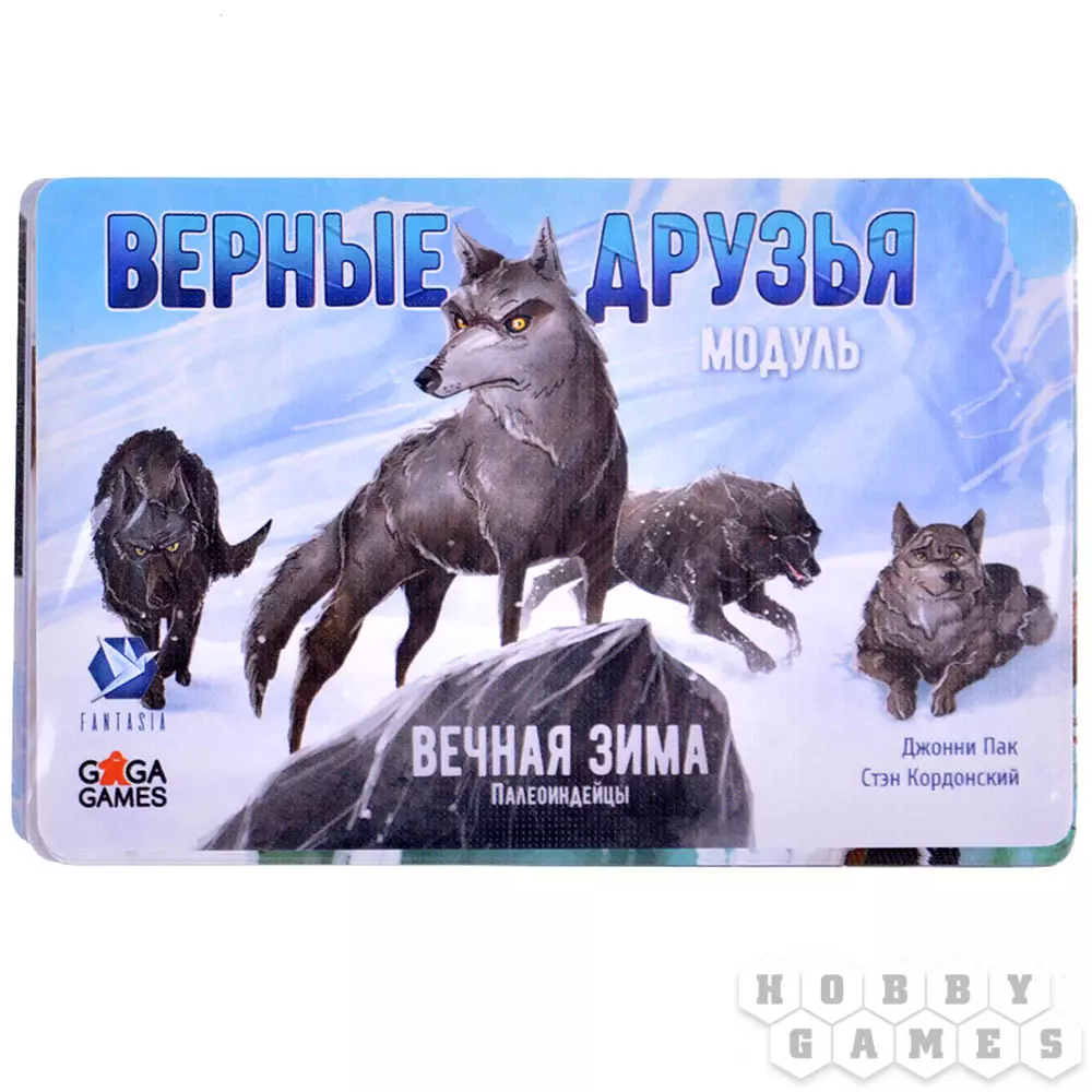 "Вечная зима. Верные друзья" – это дополнительный модуль для игры "Вечная зима: Палеоиндейцы", позволяющий воспользоваться помощью четвероногих компаньонов. Когда вы используете действие "Отдых", вместо карты из основной колоды вы можете взять в руку любую карту из колоды собак. В модуле представлены четыре вида хвостатых друзей, что дадут различные бонусы в фазе затмения и во время выполнения действий.