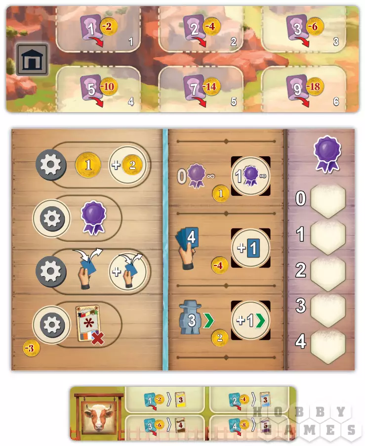 Когда пастух останавливается в той или иной локации, начинается этап действий. Вы можете построить новые здания, использовать постройки, нанять работников, купить скот, получить деньги и так далее. Каждое изображённое на жетоне действие можно выполнить только один раз, но в любом порядке. При этом у многих из них есть своя цена, которую нужно заплатить.