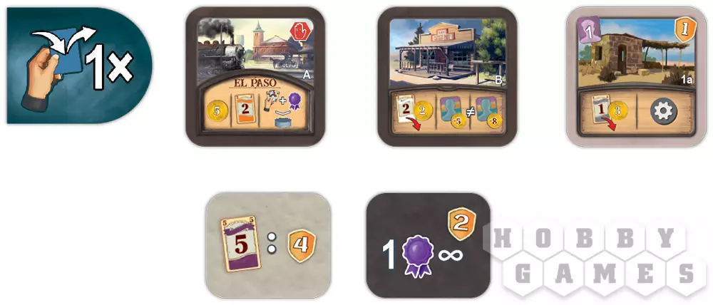 Этап движения позволит вам переместить пастуха по пути на одну или несколько локаций, в зависимости от лимита шагов на планшете. Локации с жетонами – это места, где можно выполнить различные действия. Важно помнить, что на первом ходу можно выбрать любой жетон нейтральной постройки. Когда пастух достигнет Эль-Пасо, его движение завершится, и вы должны будете выполнить все действия, связанные с этим городом.