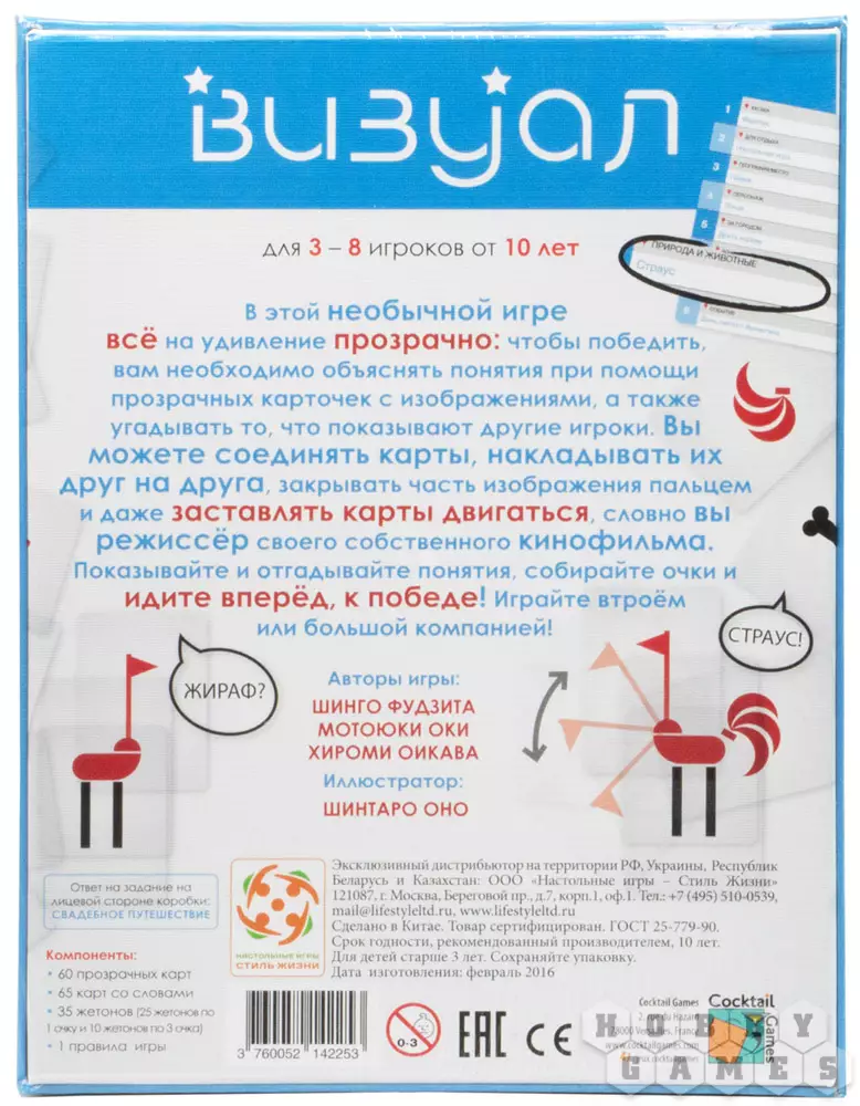 Уверены, вы ещё никогда не загадывали слова и словосочетания таким необычным образом! В игре "Визуал" вам не понадобятся ни жесты, ни мимика, ни аналогии. Для составления загадок вам в руки попадут карты. Да не обычные, а... прозрачные! На каждой карточке на прозрачном фоне красуются изображения разных предметов или явлений, и вы может составлять их как угодно, насколько только хватит фантазии.