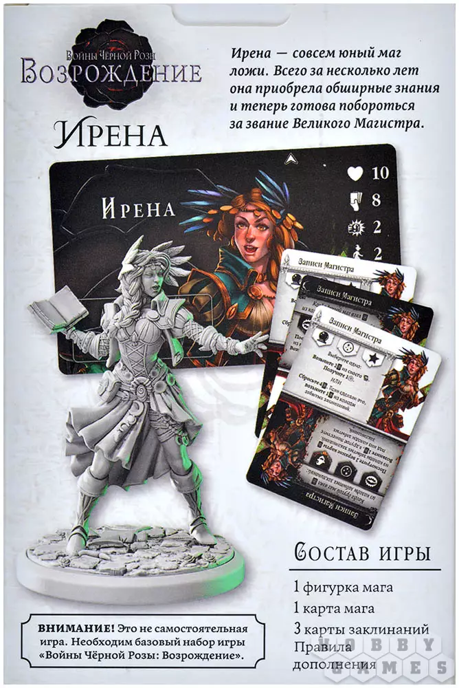 В составе дополнения "Войны Чёрной Розы: Возрождение. Ирена" вас ожидает ещё один претендент на право носить титул "Великого Магистра" – Ирена. Она имеет свою особую карту и личную колоду заклинаний. Попробуйте её в бою!