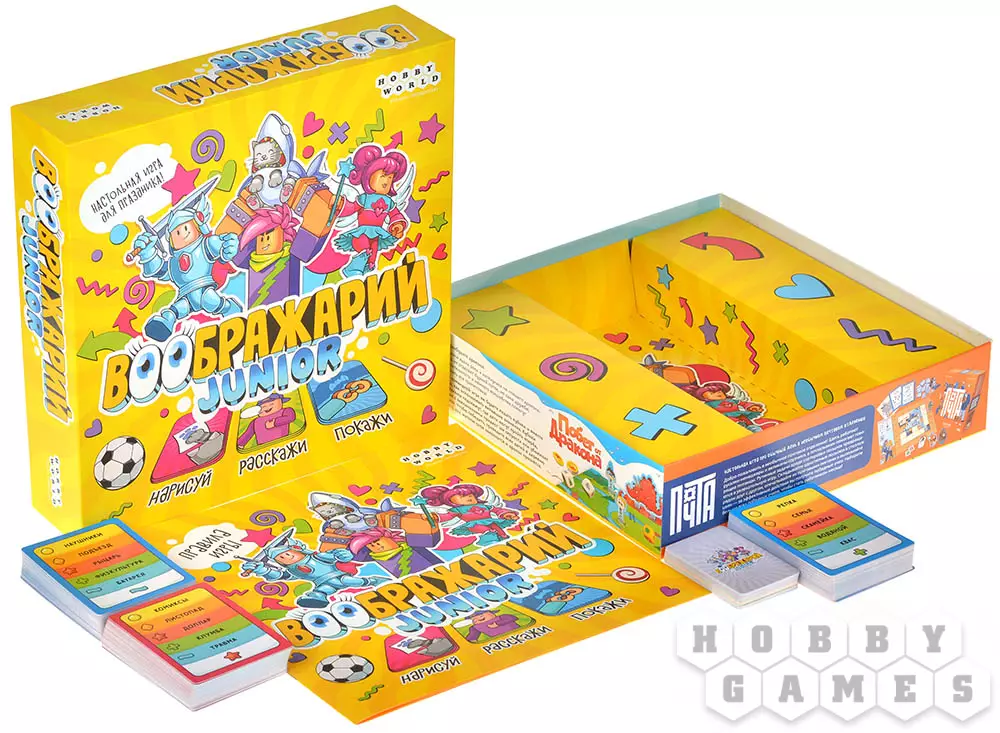 "Воображарий Junior" – это новый представитель в отличной серии настольных игр, построенных на ассоциациях. На этот раз игра была разработана специально для детей от шести лет и старше. Это отражается в адаптированных правилах, дизайне и, конечно, более подходящем наборе слов на карточках. Не бойтесь, что слова станут слишком простыми – игра предлагает два уровня сложности, где среди простых заданий вы встретите слова тип "мультфильм", "детский сад" или "микроб", а среди сложных "гордость" или "блокада".